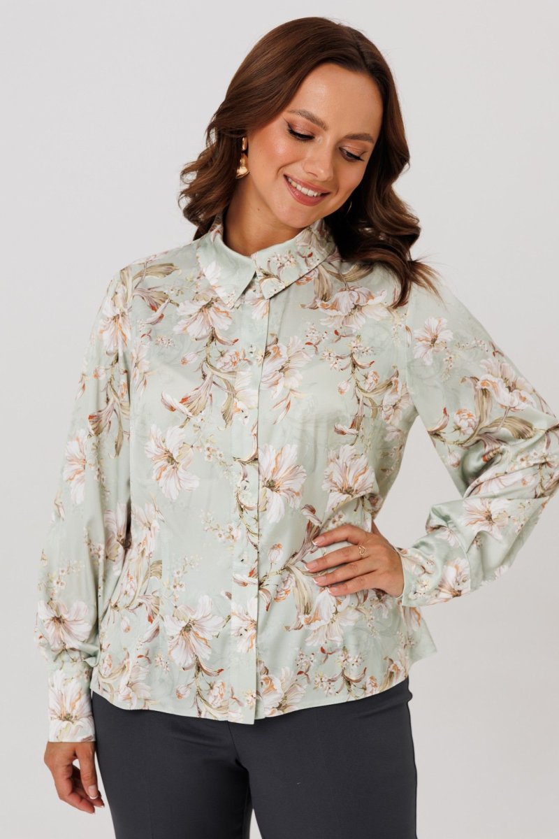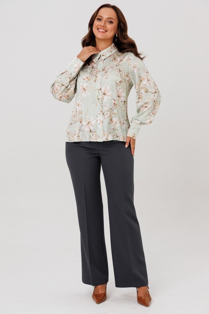 Блуза полуприлегающего силуэта, выполнена из хлопка (чуть тянется). По переду нагрудные вытачки, центральная застежка на петли-пуговицы. По спинке талиевые вытачки. Горловина оформлена рубашечным воротником со стойкой. Рукава втачные, одношовные со складками и притачной манжетой по низу, застегивающейся на пуговицы.