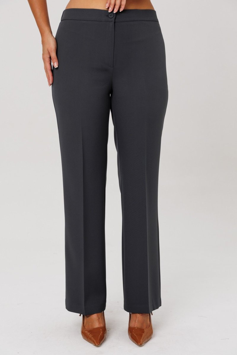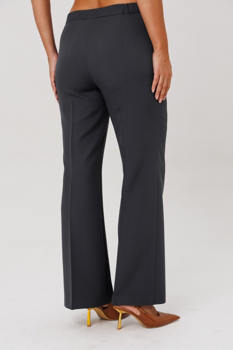 Брюки с высокой посадкой, расширенные от колена к низу, выполнены из костюмной ткани (тянется). По срезу банта-застежка-молния. Верхний срез оформлен поясом с эластичной резинкой по задней половинке. Брюки без карманов.