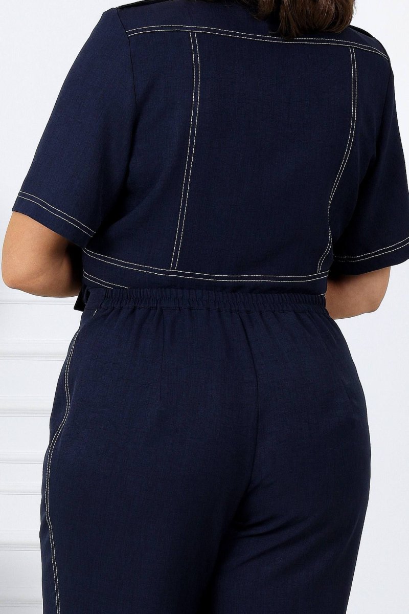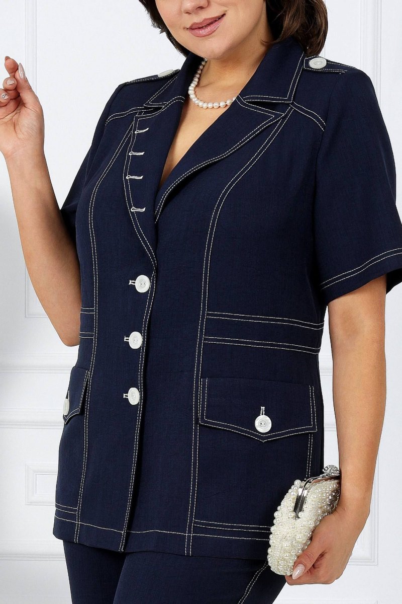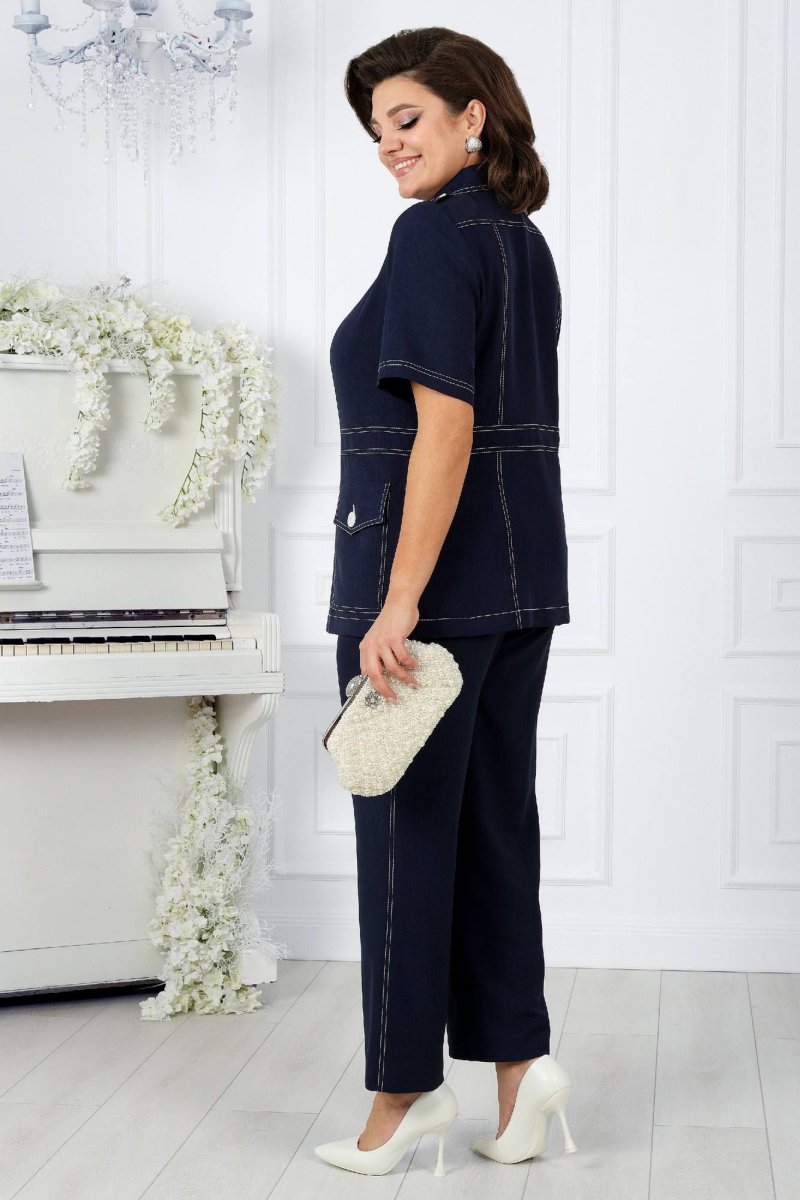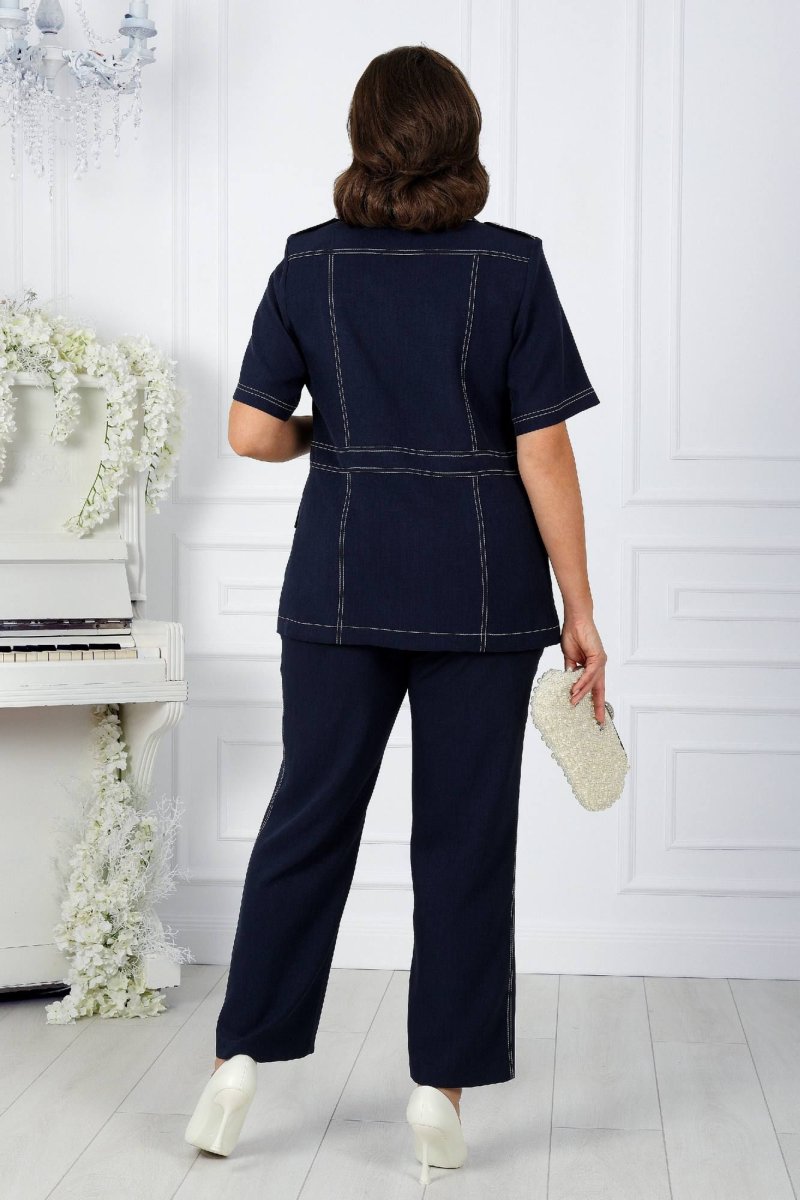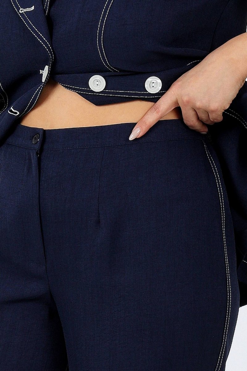 Особенностью этого костюма является контрастная двойная отделочная строчка на жакете. Эти элементы не только добавляет интереса к образу, но и создает визуальное подчеркивание, что помогает создать идеальный силуэт для женщин с большими размерами. Контрастные строчки выгодно подчеркивают форму жакета, делая его более стройным и элегантным.