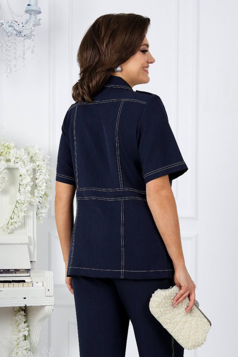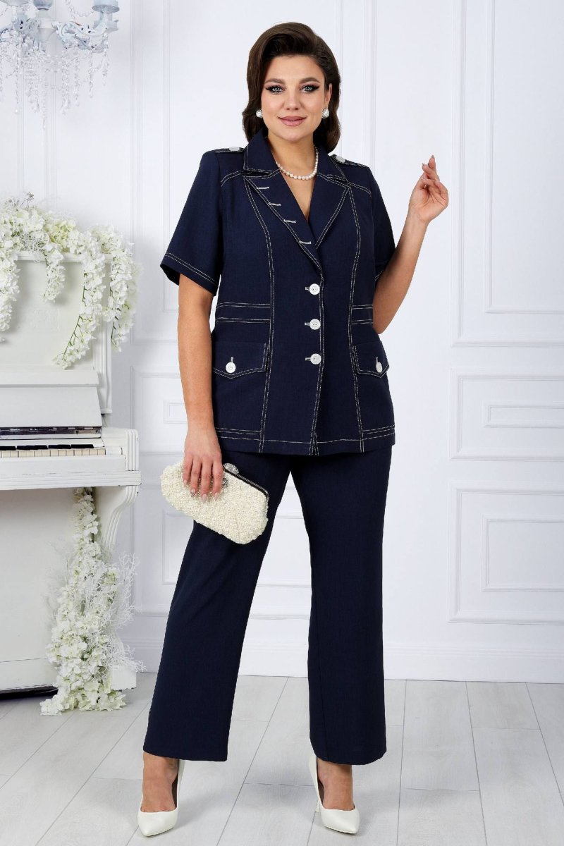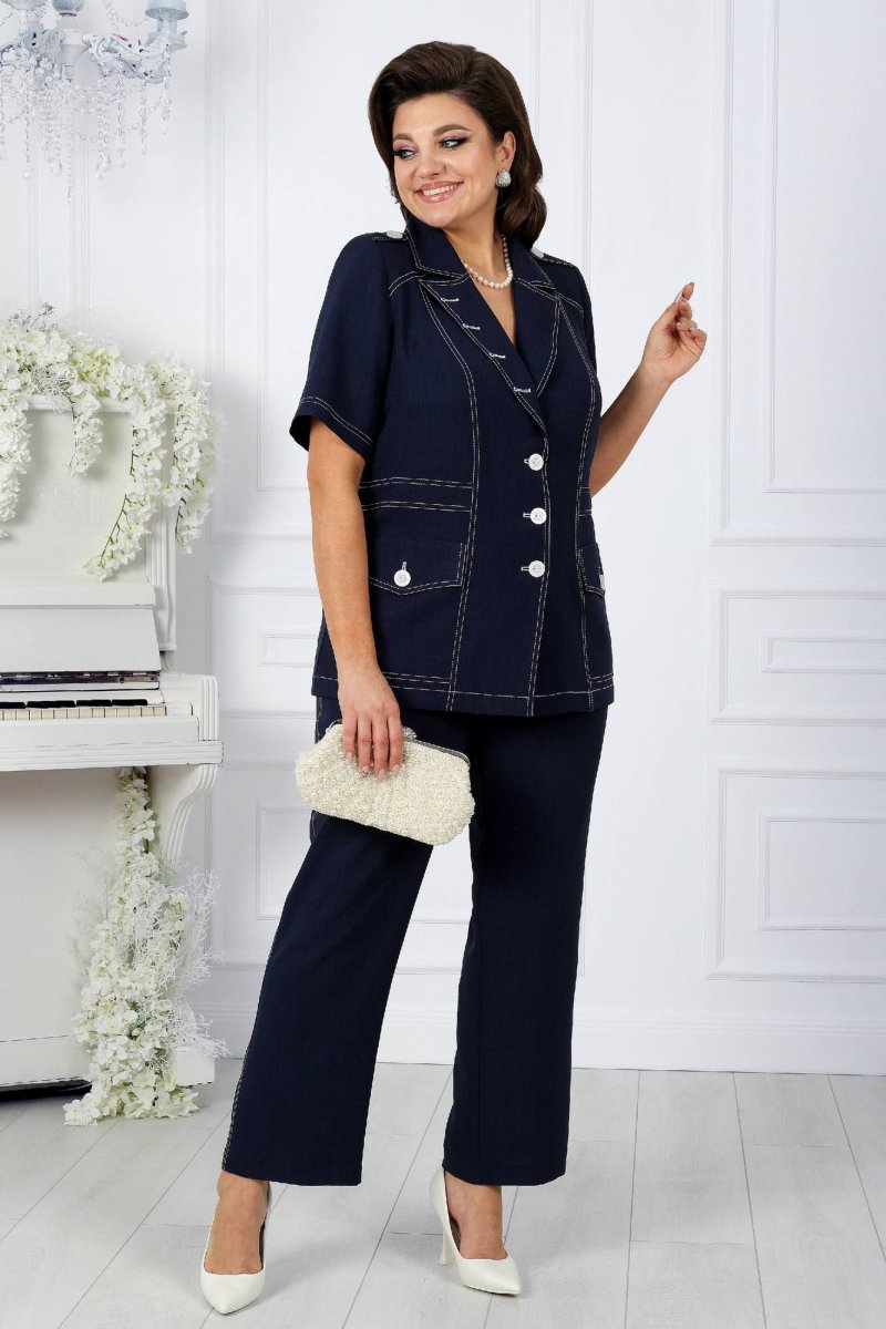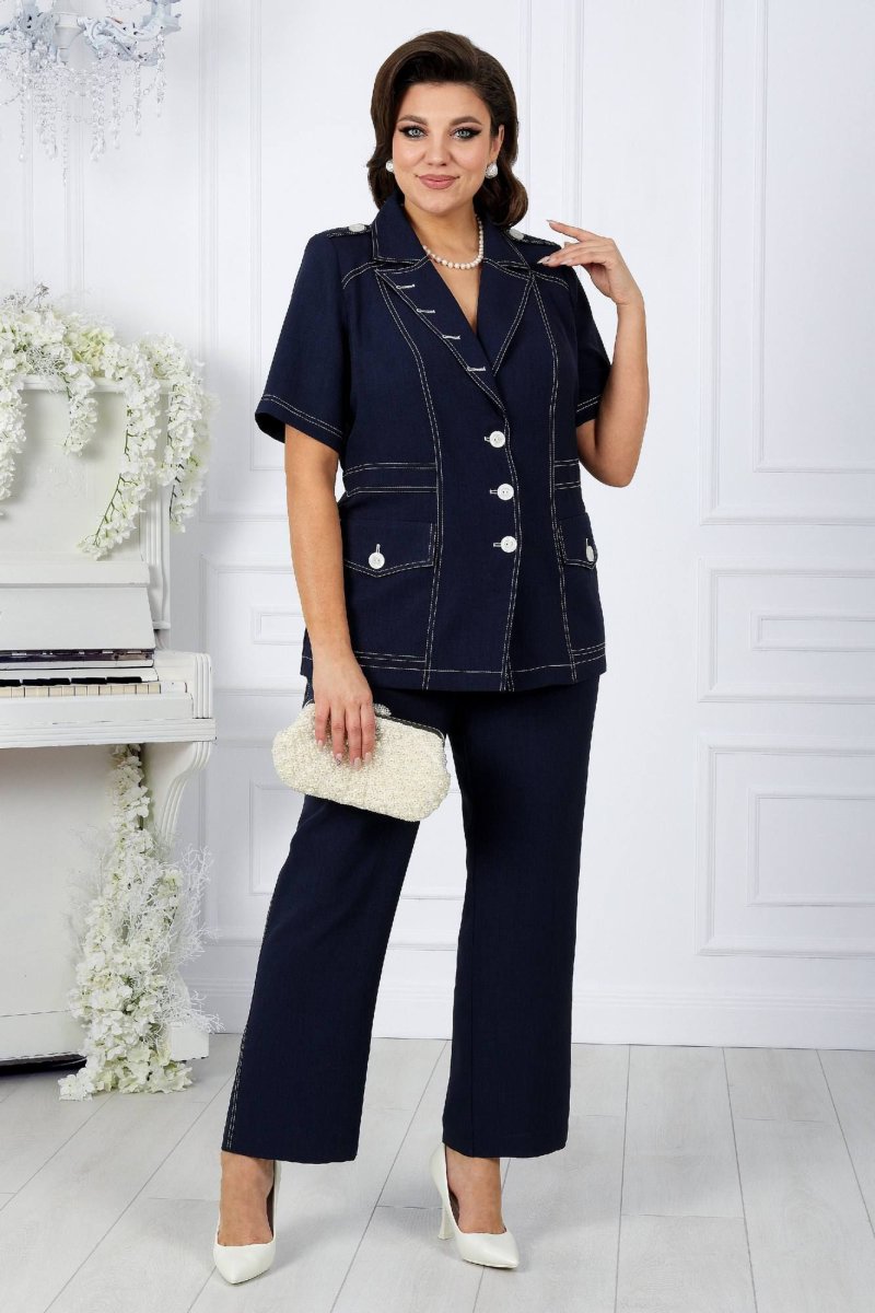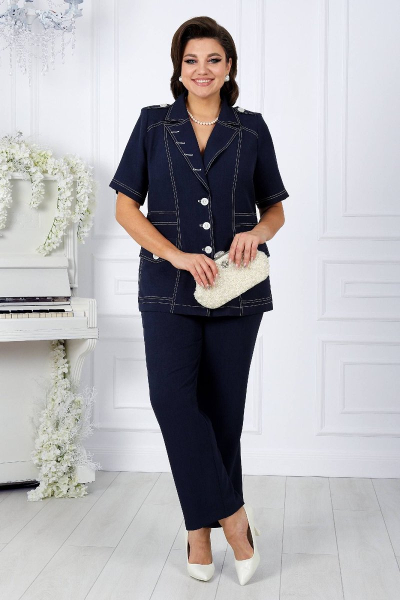 Особенностью этого костюма является контрастная двойная отделочная строчка на жакете. Эти элементы не только добавляет интереса к образу, но и создает визуальное подчеркивание, что помогает создать идеальный силуэт для женщин с большими размерами. Контрастные строчки выгодно подчеркивают форму жакета, делая его более стройным и элегантным.