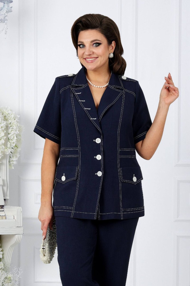 Жакет полуприлегающего силуэта, с центральной бортовой застежкой на 3 петли и 3 пуговицы до перегиба лацкана. Воротник пиджачного типа, на правом лацкане выметаны 4 глазковые неразрезные декоративные петли. Длина изделия по середине спинки 70 см, до шва втачивания воротника.