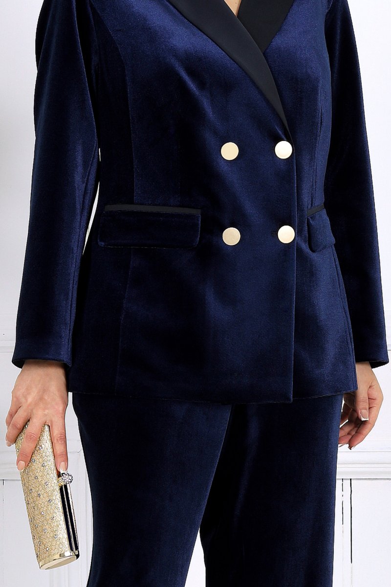 Жакет классический на подкладке, выполнен из велюра. Модель полуприлегающего силуэта с отложным воротником и лацканами «ласточкино крыло». Спереди обработаны смещенные к боковым рельефные швы, направленные от пройм до низа, и вытачки, идущие от прорезных карманов с клапаном до центра груди. Перед с двубортной внешней застежкой на 2 металлические пуговицы и внутренней на 2 потайные. Спинка со средним и рельефными швами. Рукав длинный, втачной, двухшовный. Воротник, лацканы и «рамка» кармана выполнены из сатина в цвет основной ткани. Длина жакета-67 см; длина рукава-61 см.