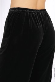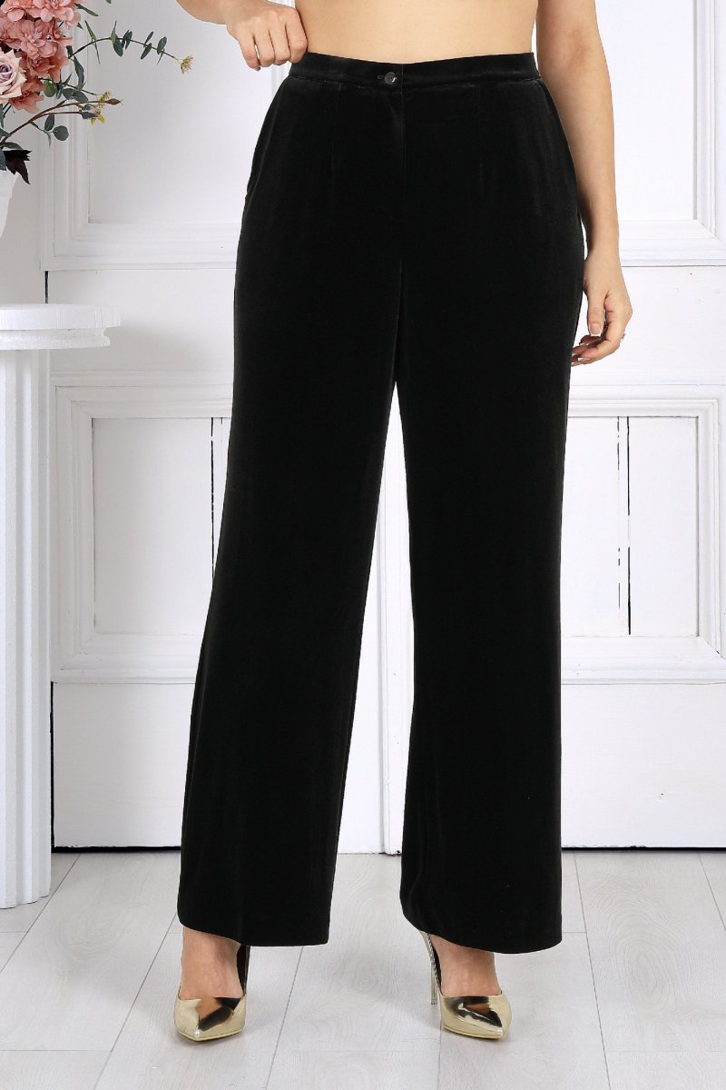 Брюки классические длинные, прямого силуэта, с посадкой на талии, выполнены из трикотажного полотна «велюр». Модель с центральной застёжкой на тесьму-«молнию», на притачном поясе, застегивающемся на петлю и пуговицу. Передние и задние половинки брюк с талиевыми вытачками, направленными от пояса вниз. Спереди обработаны боковые наклонные карманы. Для лучшего прилегания брюк в области талии в поясе по задним половинкам вставлена эластичная лента. Длина брюк по боковому (с поясом)-107 см (52-54 р-р), 108 см (56-60 р-р).