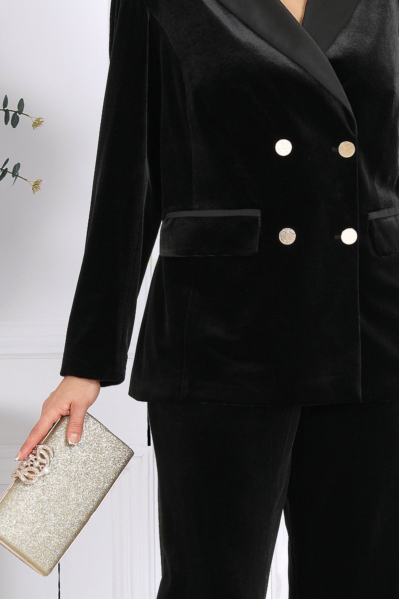 Жакет классический на подкладке, выполнен из велюра. Модель полуприлегающего силуэта с отложным воротником и лацканами «ласточкино крыло». Спереди обработаны смещенные к боковым рельефные швы, направленные от пройм до низа, и вытачки, идущие от прорезных карманов с клапаном до центра груди. Перед с двубортной внешней застежкой на 2 металлические пуговицы и внутренней на 2 потайные. Спинка со средним и рельефными швами. Рукав длинный, втачной, двухшовный. Воротник, лацканы и «рамка» кармана выполнены из сатина в цвет основной ткани. Длина жакета-67 см; длина рукава-61 см.