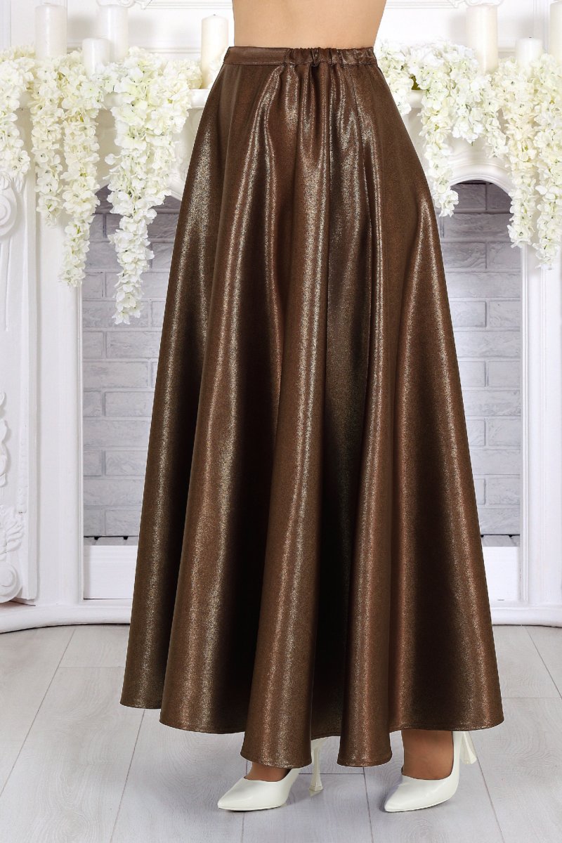 Юбка-полусолнце, с посадкой на талии, выполнена из костюмно-плательного сатина с напылением. Модель на трикотажной подкладке. В среднем шве заднего полотнища обработана застежка на потайную тесьму-«молнию» (20 см). Притачной пояс застегивается по спинке на 1 петлю и 1 пуговицу; для лучшего прилегания по линии талии в поясе предусмотрена эластичная лента, вставленная над боковыми швами. Длина по среднему шву (с поясом) - 99 см.