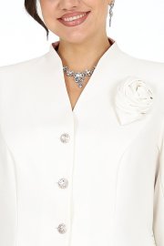 Жакет однобортный, полуприлегающего силуэта, выполнен из костюмно-плательного крепа с напылением. Модель на поливискозной подкладке, с плечевыми накладками. Перед с рельефными швами, направленными от пройм, и центральной внешней застежкой на 4 декоративные пуговицы. Спинка со средним швом и рельефами, направленными от пройм до низа. Горловина оформлена стойкой, цельнокроеной с деталями переда и спинки. Рукав длинный, втачной. Жакет дополнен съемным «цветком» из основной ткани. Длина жакета (с воротником) – 61 см; длина рукава – 60,5 см.