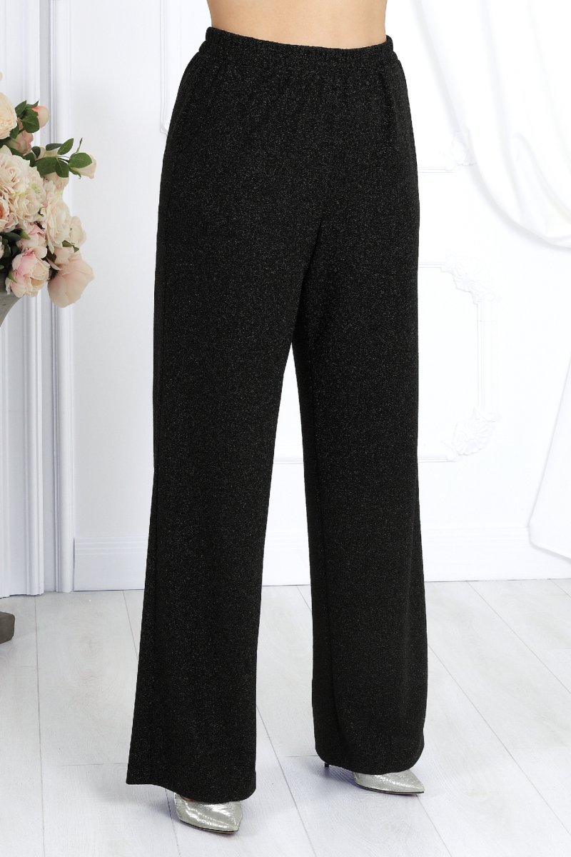 Брюки классические длинные, прямого силуэта, с посадкой на талии, выполнены из трикотажного полотна с фактурной лицевой стороной «люрекс». Модель без застёжки, на притачном поясе, с эластичной лентой внутри.