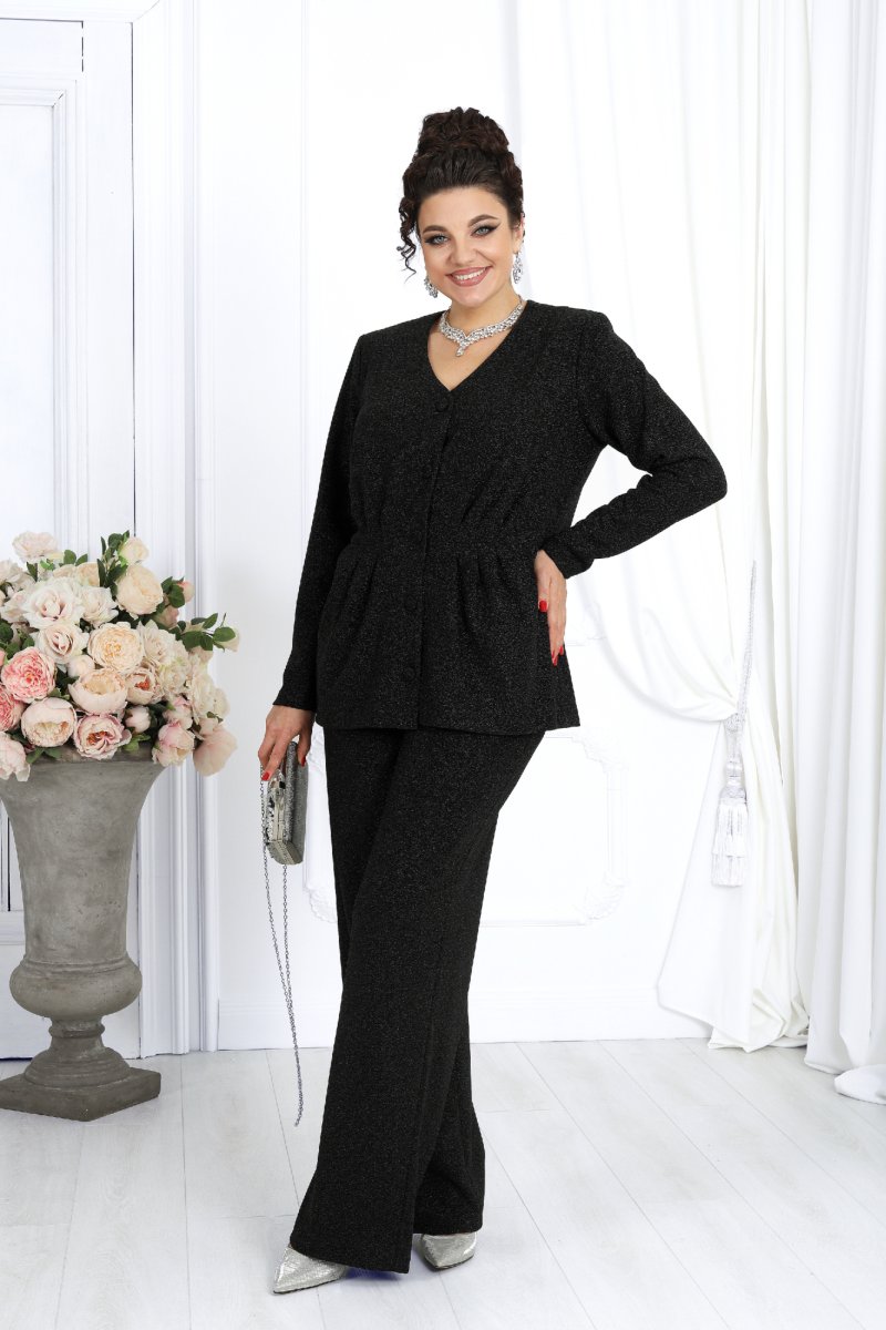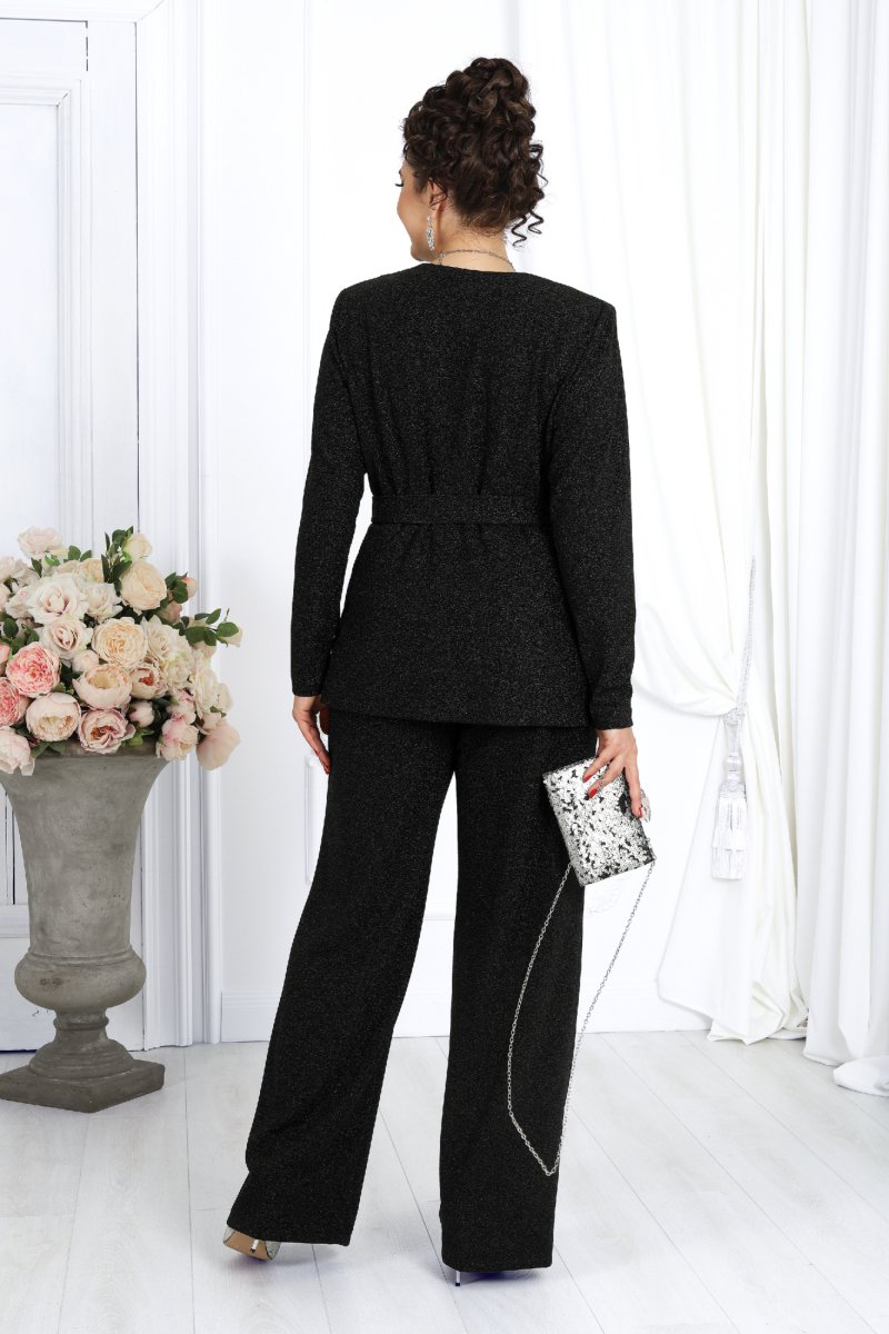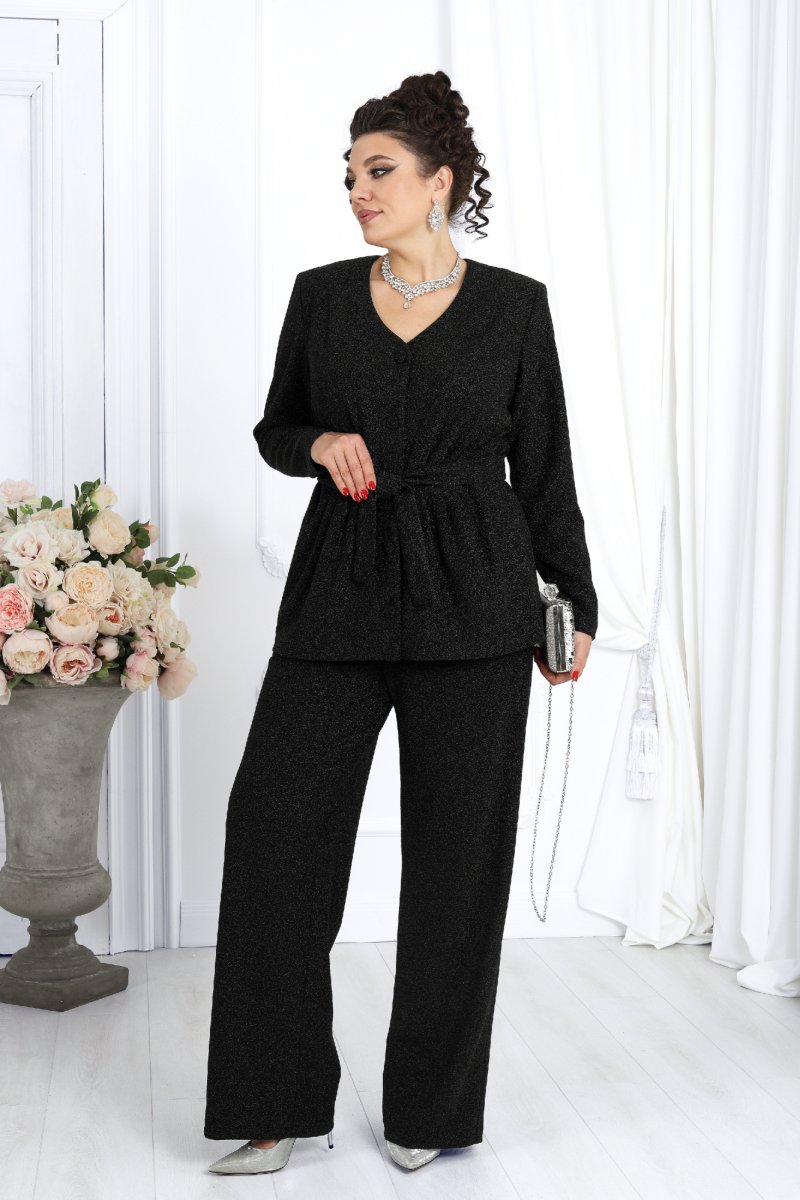 Элегантный брючный комплект – идеальный выбор для праздника, вечера в ресторане или важного мероприятия. Жакет с выразительным V-образным вырезом и аккуратными складками по линии талии подчёркивает женственный силуэт, а сияющая ткань с люрексом придаёт образу динамику и мягкость, создавая гармоничное сочетание классики и современности.