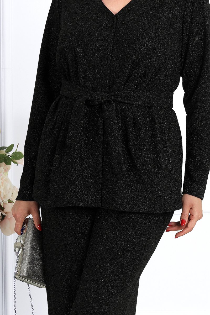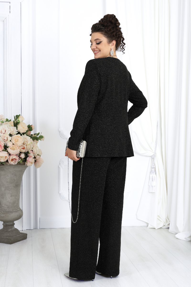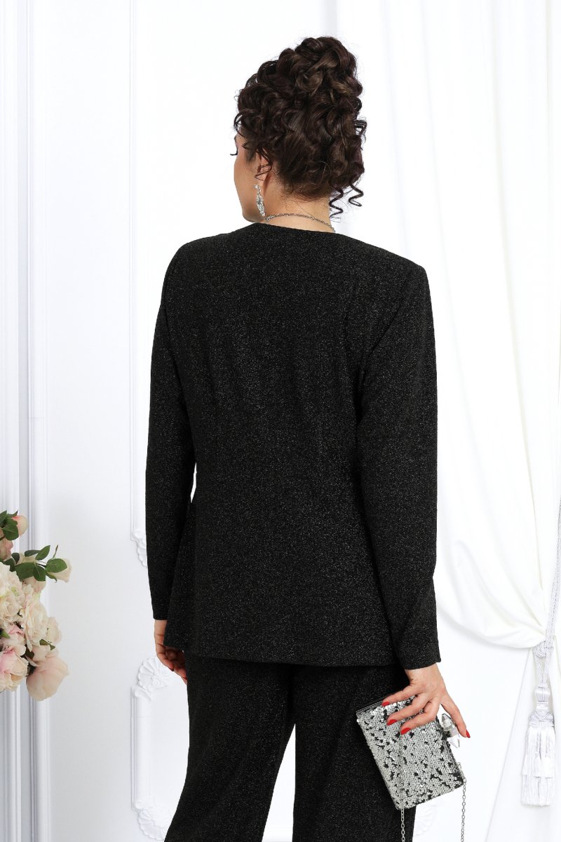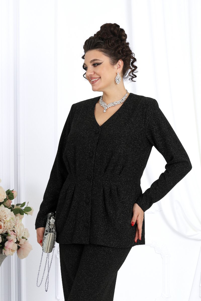 Элегантный брючный комплект – идеальный выбор для праздника, вечера в ресторане или важного мероприятия. Жакет с выразительным V-образным вырезом и аккуратными складками по линии талии подчёркивает женственный силуэт, а сияющая ткань с люрексом придаёт образу динамику и мягкость, создавая гармоничное сочетание классики и современности.