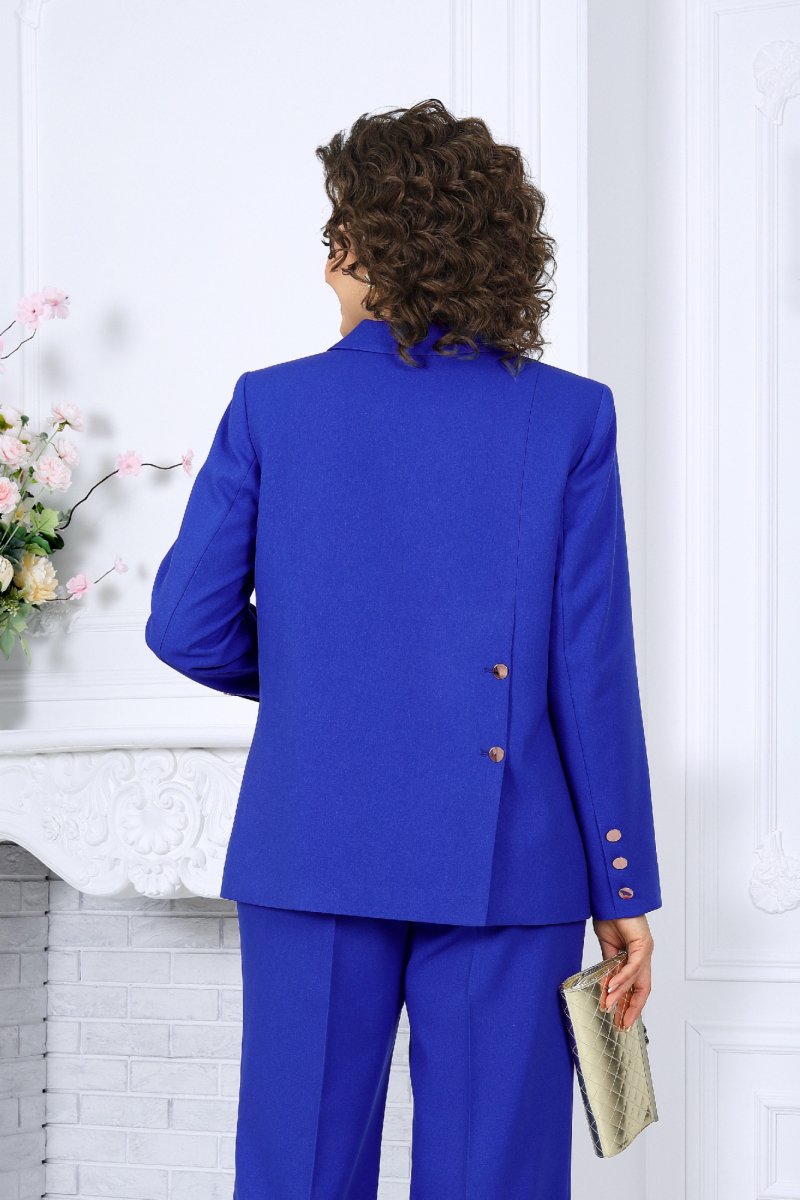 Жакет двубортный, полуприлегающего силуэта, выполнен из костюмной поливискозы. Модель на подкладке, с плечевыми накладками. Спереди обработаны рельефные швы, направленные от пройм до низа; в нижней части переда расположены прорезные карманы с клапаном. Перед со смещенной внешней застежкой на 2 декоративные пуговицы и внутренней на 2 потайные. Спинка асимметричная, с одним вертикальным рельефным швом, направленным от правого плечевого до низа; в шве обработана высокая шлица с застежкой на 2 декоративные пуговицы. Воротник пиджачного типа. Рукав длинный, втачной; в нижней части локтевого шва – имитация шлицы с застежкой на 3 пуговицы. Длина жакета - 66 см; длина рукава - 61 см.