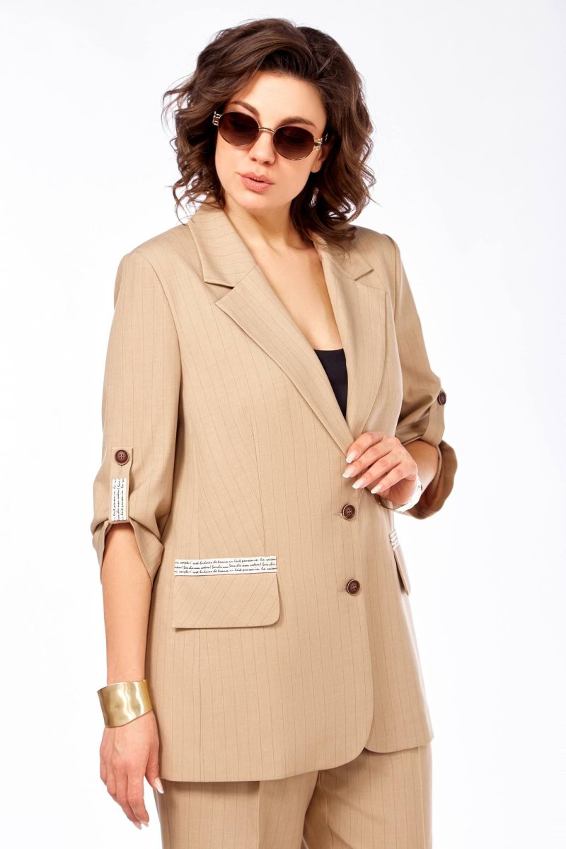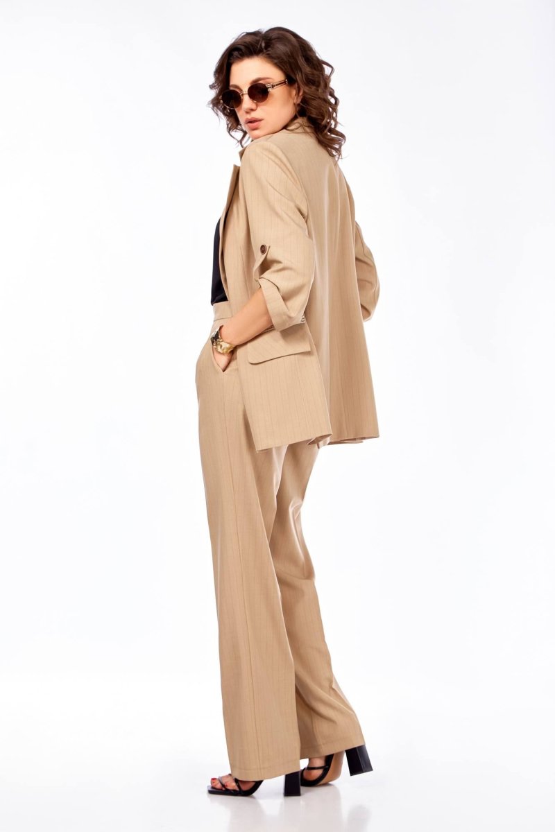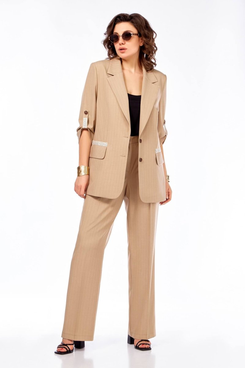 Стильный костюм из мягкой приятной ткани. Жакет прямого силуэта, с застежкой на две пуговицы. На полочке и спинке рельефные швы. На полочке карманы с клапанами, на спинке две шлицы. Хлопковая подкладка по переду и спинке. Рукав прямой трехчетвертной с патой, застегивающейся на пуговицу. На клапанах и патах декоративная пришивная тесьма. Брюки слегка расширенного силуэта, по спинке резинка по поясу, с застежкой на молнию и петлю и пуговицу.