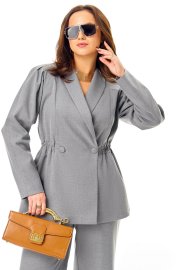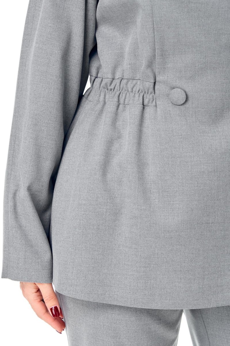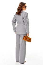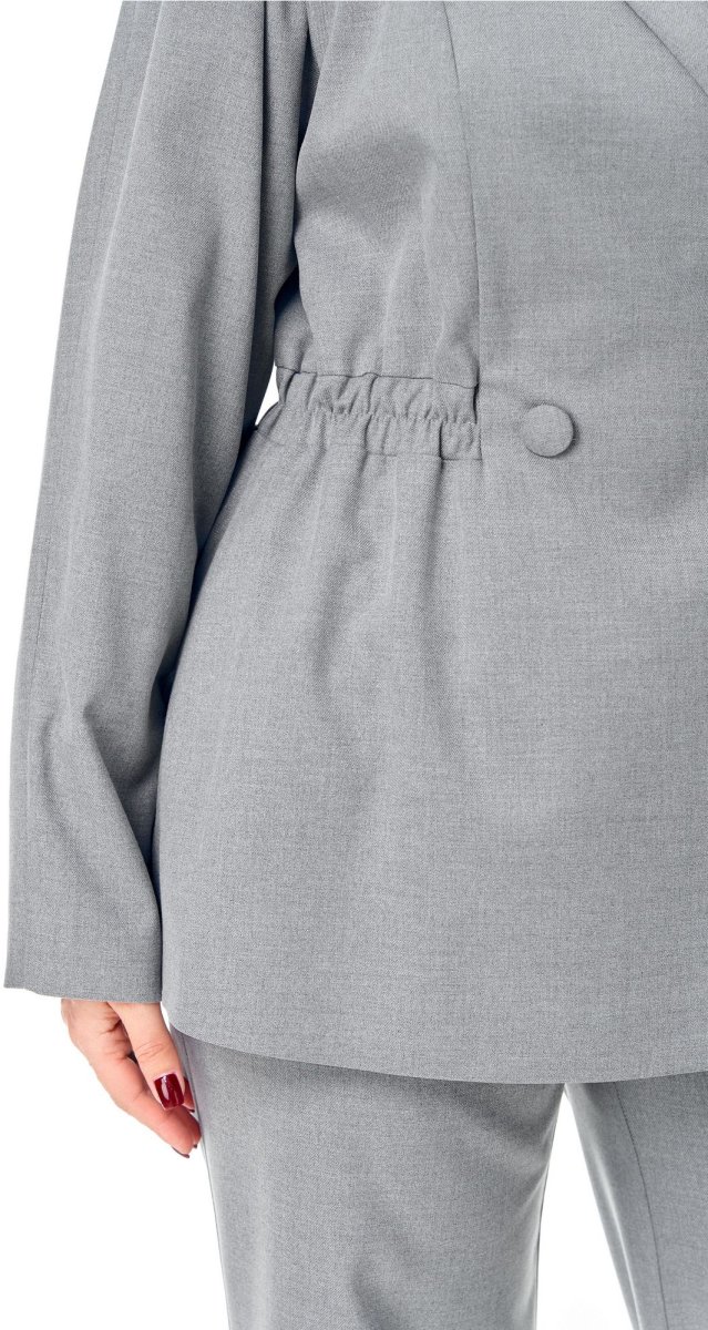 Элегантный костюм, состоит из жакета и брюк, жакет полуприлегающего силуэта, с двубортной застежкой на петли и пуговицы, рельефными швами. Воротник-шаль, рукав реглан со складками сверху. В области талии отрезная кулиска, в которую вставляется резинка. Длина ниже линии бедер, на подкладке. Брюки палаццо, на поясе на резинке без застежки, карманы в боковых швах.