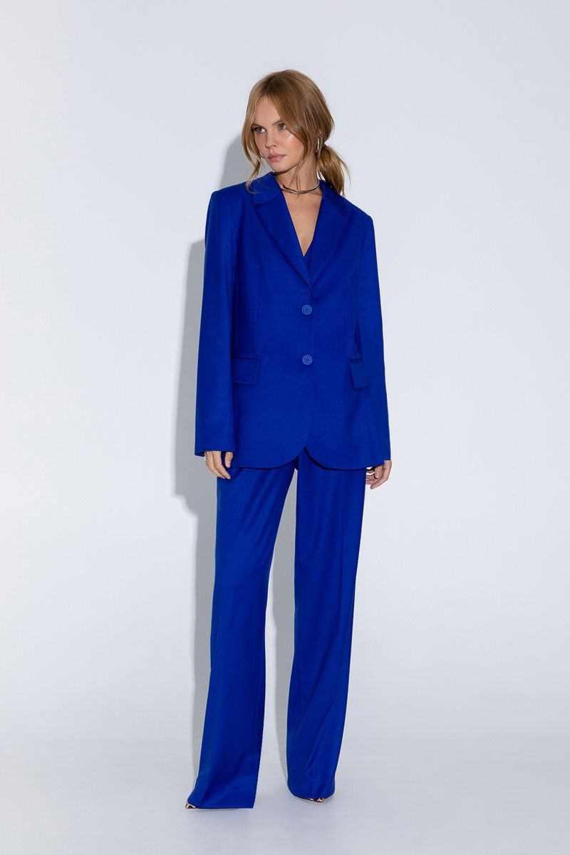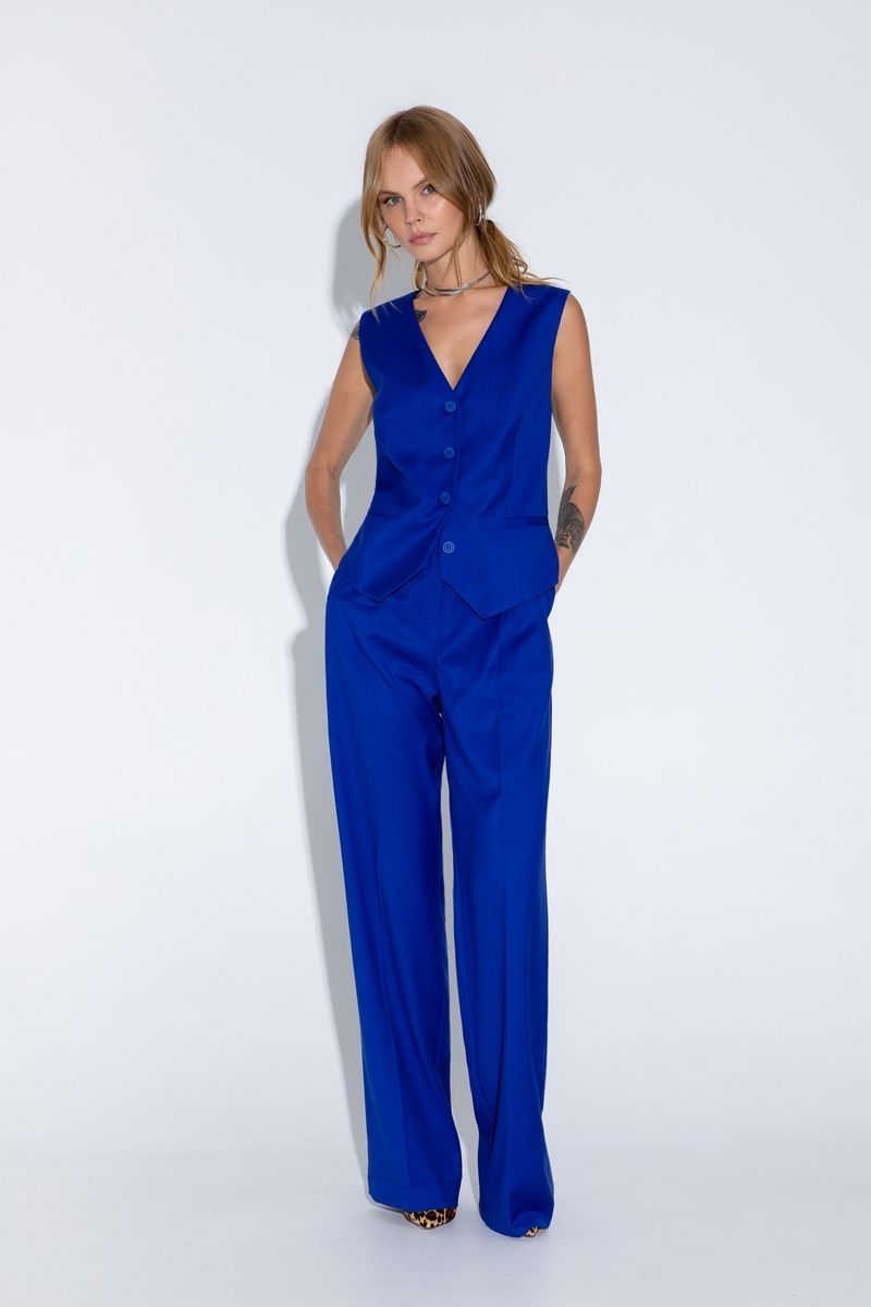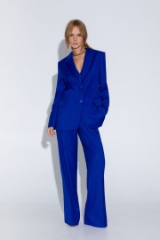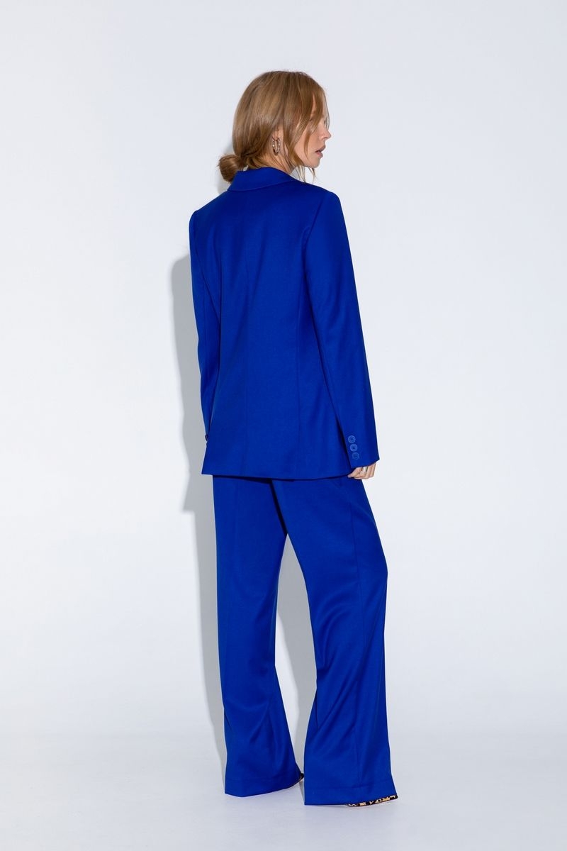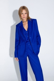 Текстильный костюм-тройка из свободного жакета со шлицами, жилета и прямых брюк-палаццо Детали: жакет полуприлегающего силуэта, талиевые вытачки, пиджачный воротник, застежка на две петли и пуговицы, функциональные карманы, рукава и спинка со шлицами, жакет на подкладке из 100% вискозы. Жилет полуприлегающего силуэта с фигурным низом, застежка на петли и пуговицы, на подкладке из 100% вискозы. Брюки с высокой посадкой на притачном поясе со шлевками, застежка на молнию и пуговицу, боковые карманы, передние половины с заутюженными стрелками и двумя небольшими складками Длина жакета по спинке около 70 см в размерах 40-46 и около 73 см в размерах 48-52 Длина рукавов около 63 см Длина жилета по спинке около 48,5 см в размерах 40-46 и около 51,5 см в размерах 48-52 Длина брюк по боковому шву с поясом около 113 см в размерах 40-46 и около 114,5 см в размерах 48-52, длина по внутреннему шву около 82 см