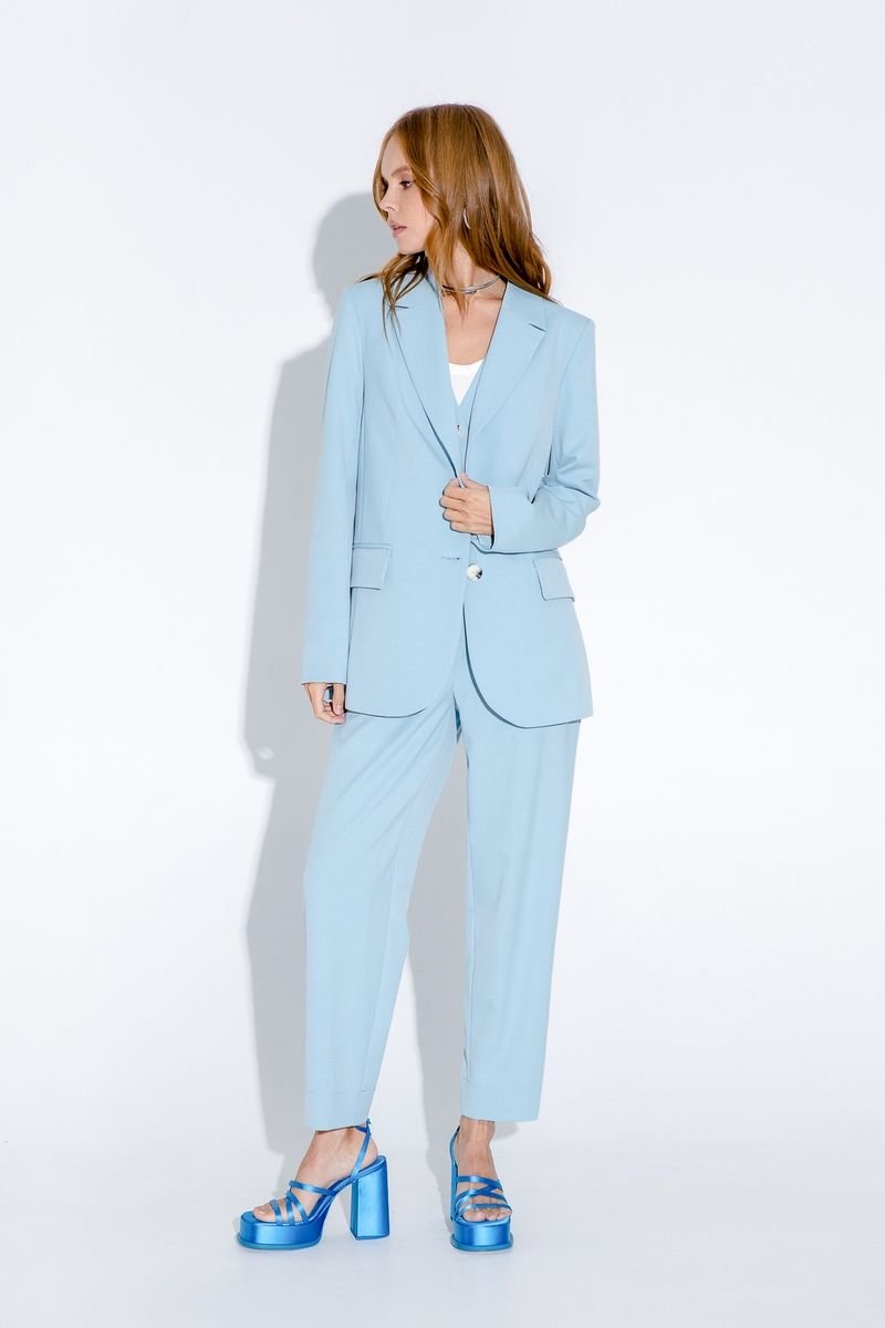 Детали: жакет полуприлегающего силуэта, талиевые вытачки, пиджачный воротник, застежка на две петли и пуговицы, функциональные карманы, рукава и спинка со шлицами, жакет на подкладке из 100% вискозы. Брюки с высокой посадкой, притачной пояс со шлевками, задняя часть пояса эластичная- с резинкой, застежка на молнию и пуговицу, боковые карманы, передние половины с двумя складками