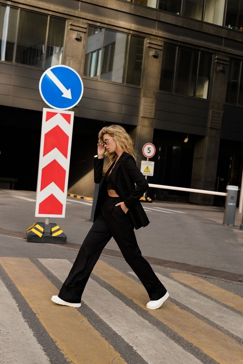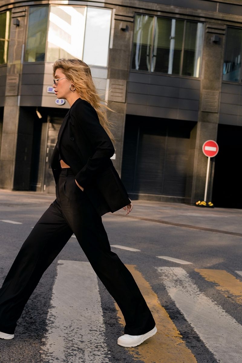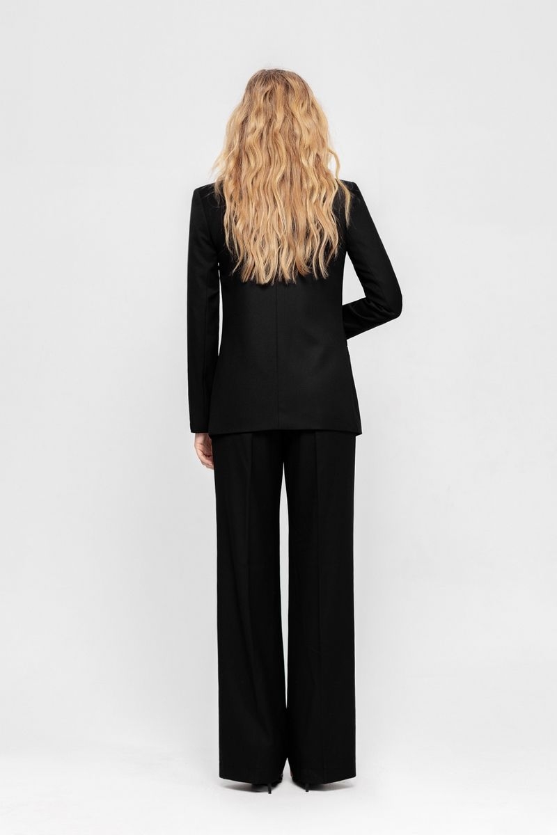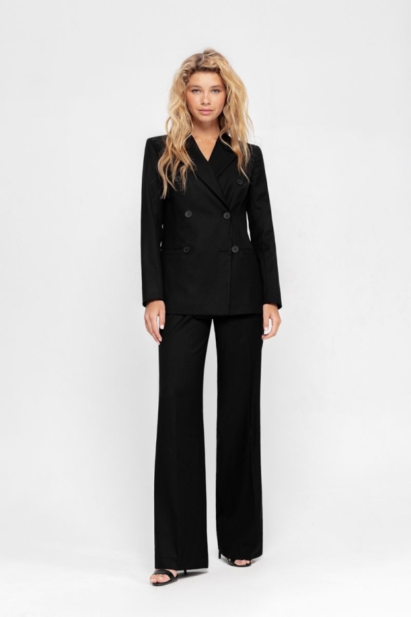 Текстильный костюм-двойка из классического двубортного жакета и брюк-палаццо Детали: жакет прямого силуэта, пиджачный воротник, перед с прорезными карманами, двубортная застежка на петли и пуговицы, спинка со средним швом, рукава втачные двухшовные, жакет на подкладке. Брюки с высокой посадкой на притачном поясе со шлевками, застежка на молнию и пуговицу, боковые карманы, передние половины с заутюженными стрелками и двумя небольшими складками Длина жакета по спинке около 66 см в размерах 40-46 и около 69 см в размерах 48-52, длина рукавов около 61 см; Длина брюк по боковому шву с поясом около 113 см в размерах 40-46 и около 114,5 см в размерах 48-52, длина по внутреннему шву около 82 см