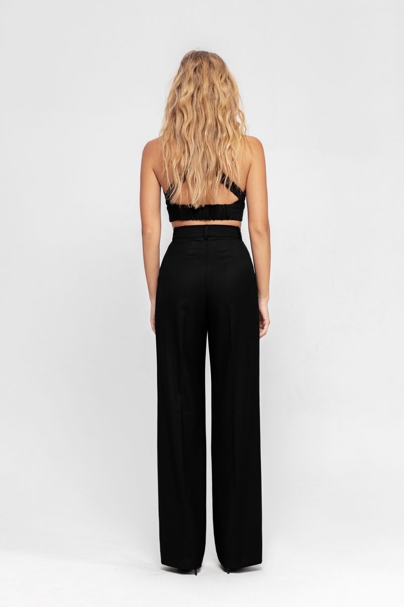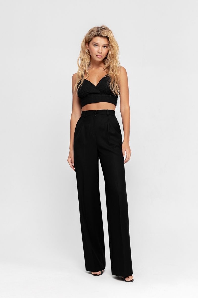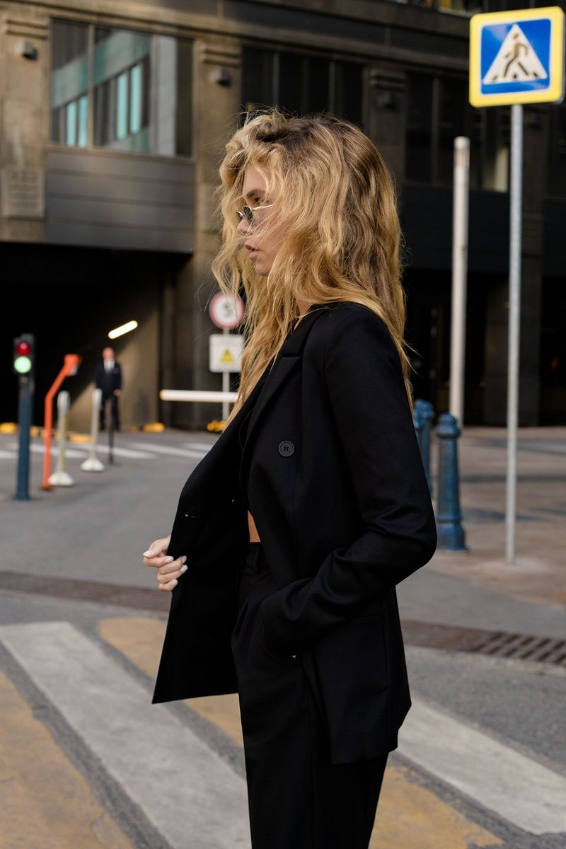 Текстильный костюм-двойка из классического двубортного жакета и брюк-палаццо Детали: жакет прямого силуэта, пиджачный воротник, перед с прорезными карманами, двубортная застежка на петли и пуговицы, спинка со средним швом, рукава втачные двухшовные, жакет на подкладке. Брюки с высокой посадкой на притачном поясе со шлевками, застежка на молнию и пуговицу, боковые карманы, передние половины с заутюженными стрелками и двумя небольшими складками Длина жакета по спинке около 66 см в размерах 40-46 и около 69 см в размерах 48-52, длина рукавов около 61 см; Длина брюк по боковому шву с поясом около 113 см в размерах 40-46 и около 114,5 см в размерах 48-52, длина по внутреннему шву около 82 см
