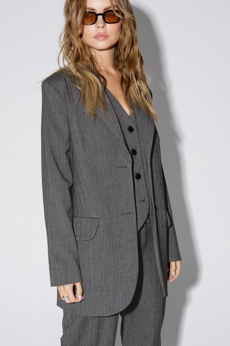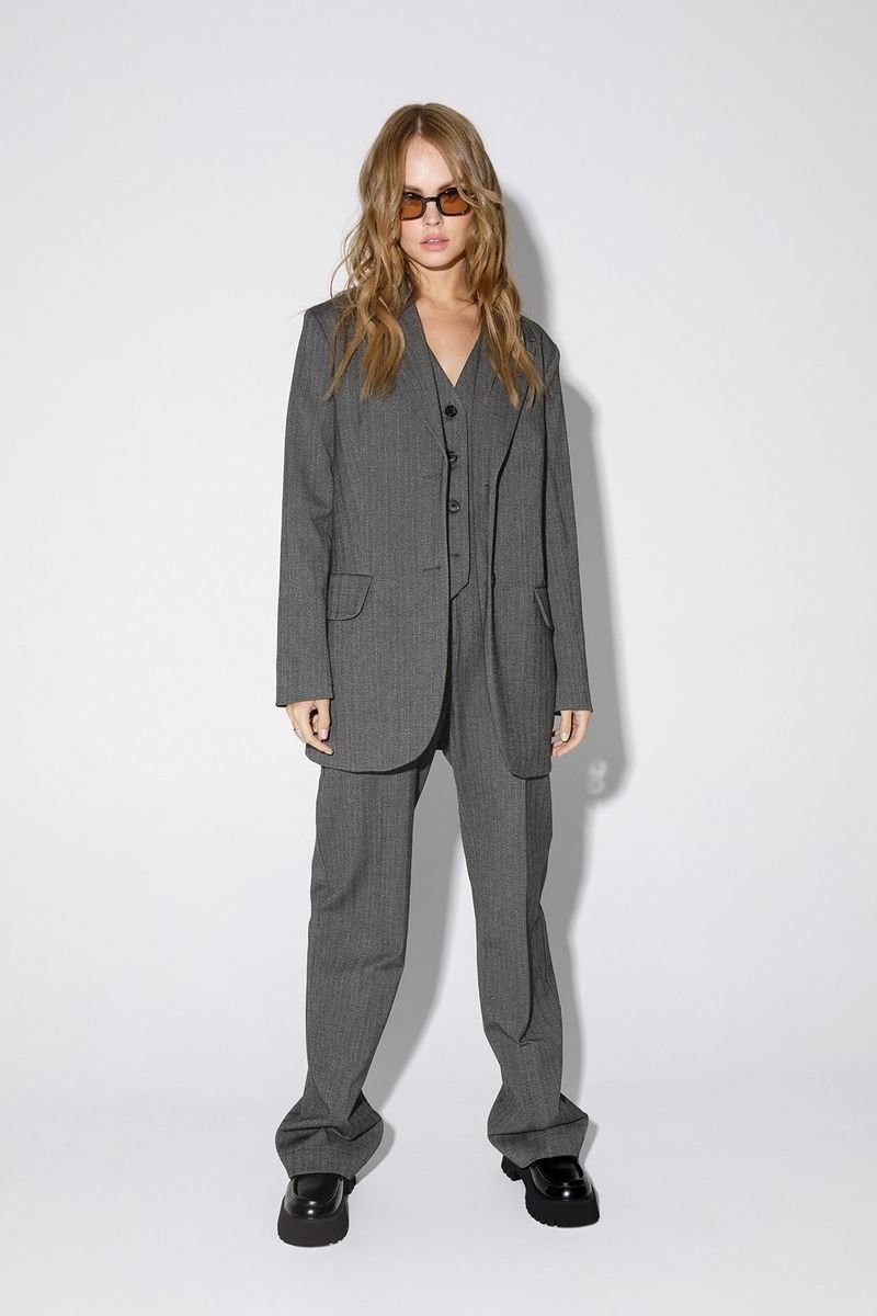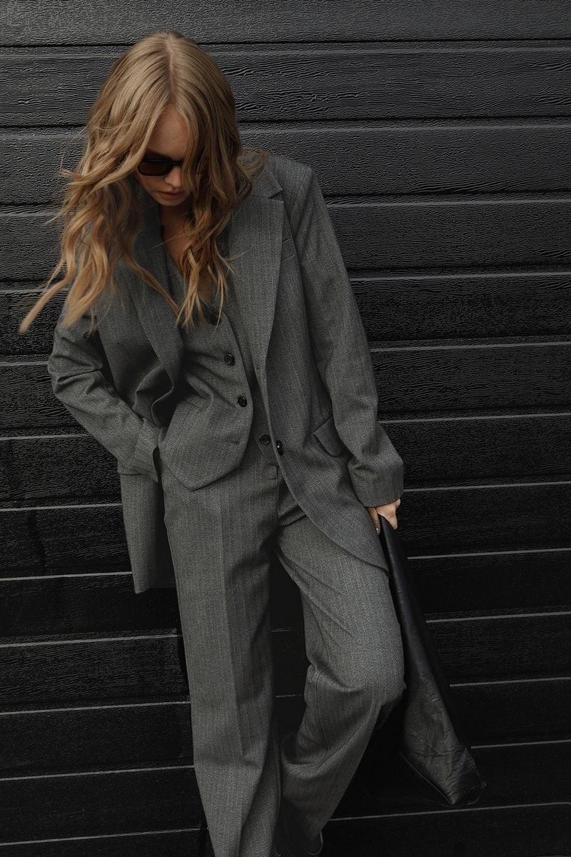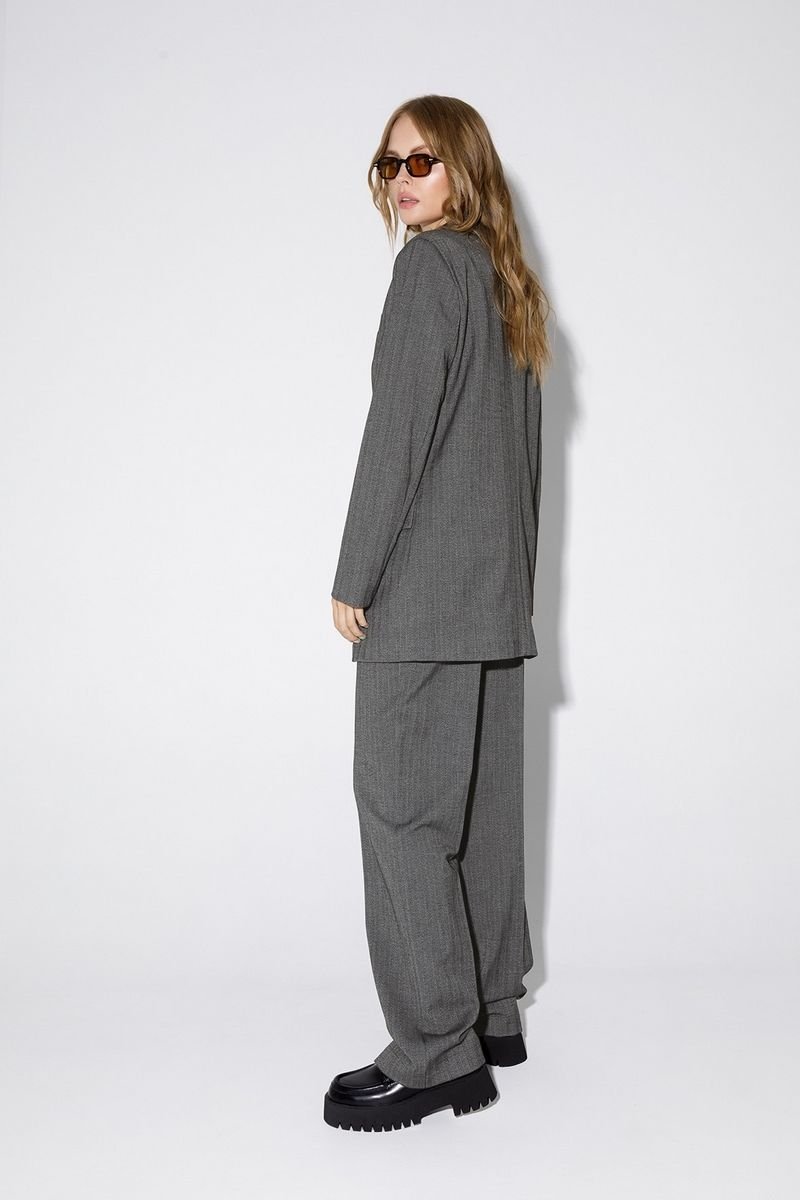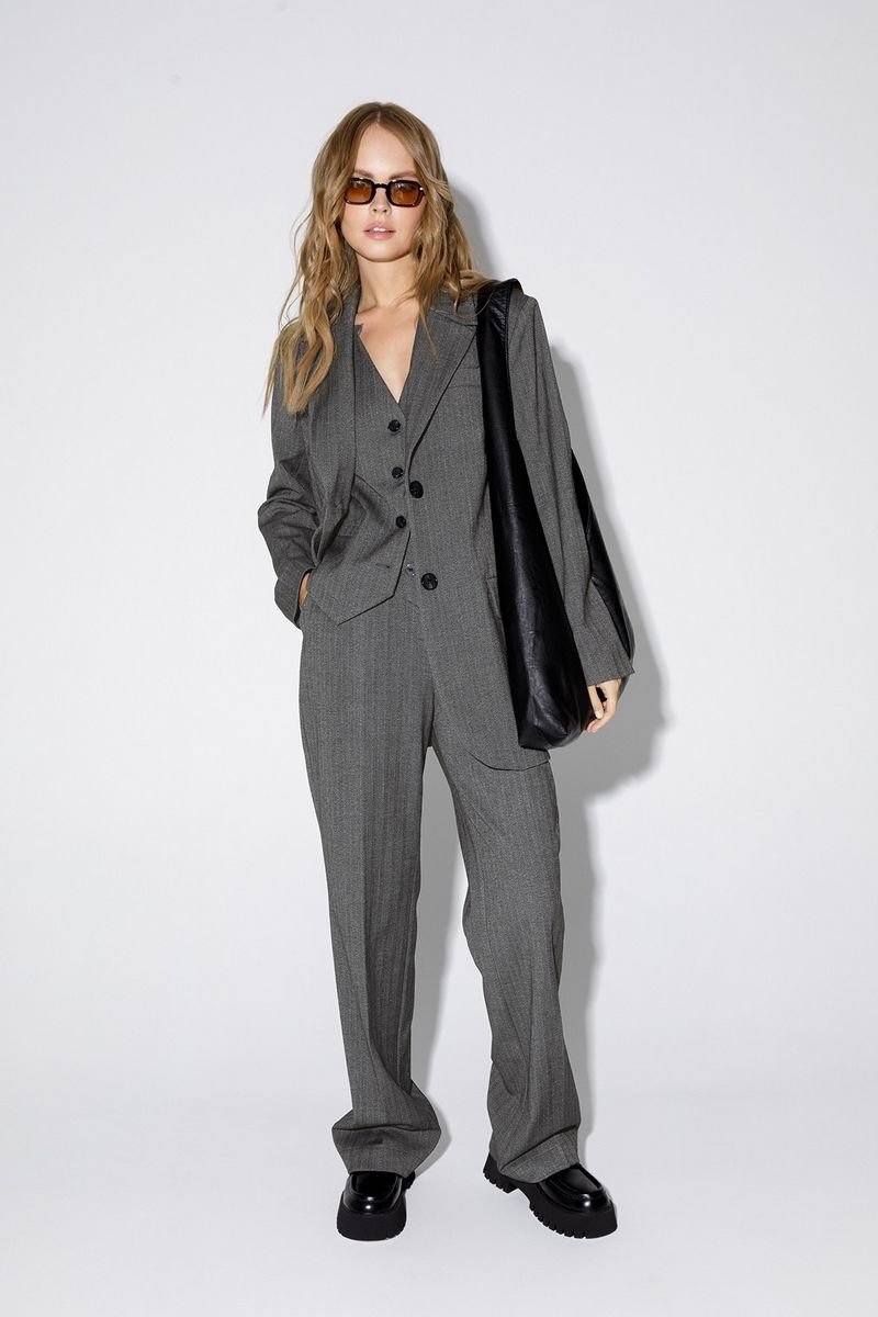 Текстильный костюм-тройка из свободного жакета, полуприлегающего жилета и прямых брюк со стрелками из текстильной ткани с рисунком «ёлочка». Детали: жакет с расширенной линией плеча, полуприлегающий силуэт, пиджачный воротник, талевые вытачки, перед с функциональным нагрудным карманом и двумя прорезными карманами с клапанами, застежка на пуговицы, спинка со средним швом, рукава втачные двухшовные, жакет на подкладке. Жилет с талевыми вытачками, застежка на петли и пуговицы, функциональные карманы, фигурный низ, на подкладке. Брюки с высокой посадкой на притачном поясе со шлевками, застежка на молнию и пуговицу, боковые карманы, передние половины с заутюженными стрелками и двумя небольшими складками