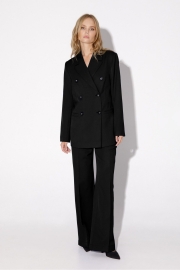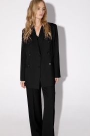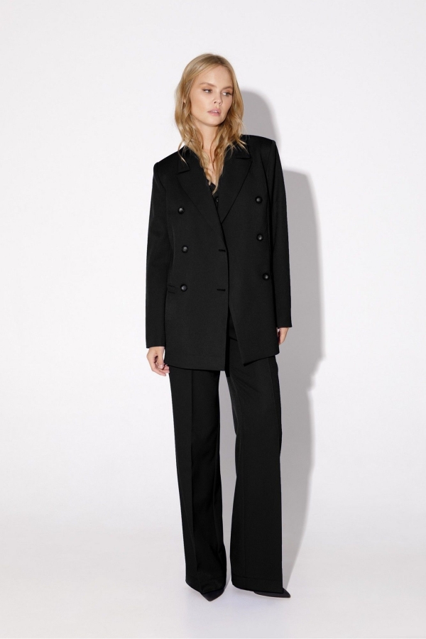 Текстильный костюм-двойка из классического двубортного жакета и прямых брюк-палаццо со стрелками. Детали: жакет полуприлегающего силуэта, пиджачный воротник, перед с прорезными карманами, двубортная застежка на петли и пуговицы, спинка со средним швом, рукава втачные двухшовные, жакет на подкладке. Брюки с высокой посадкой на притачном поясе со шлевками, застежка на молнию и пуговицу, боковые карманы, передние половины с заутюженными стрелками и двумя небольшими складками. Длина жакета по спинке около 66 см в размерах 40-46 и около 69 см в размерах 48-52, длина рукавов около 61 см. Длина брюк по боковому шву с поясом около 113 см в размерах 40-46 и около 114,5 см в размерах 48-52, длина по внутреннему шву около 82 см.