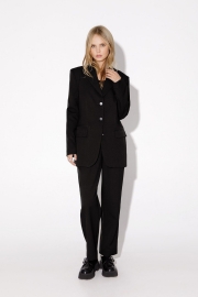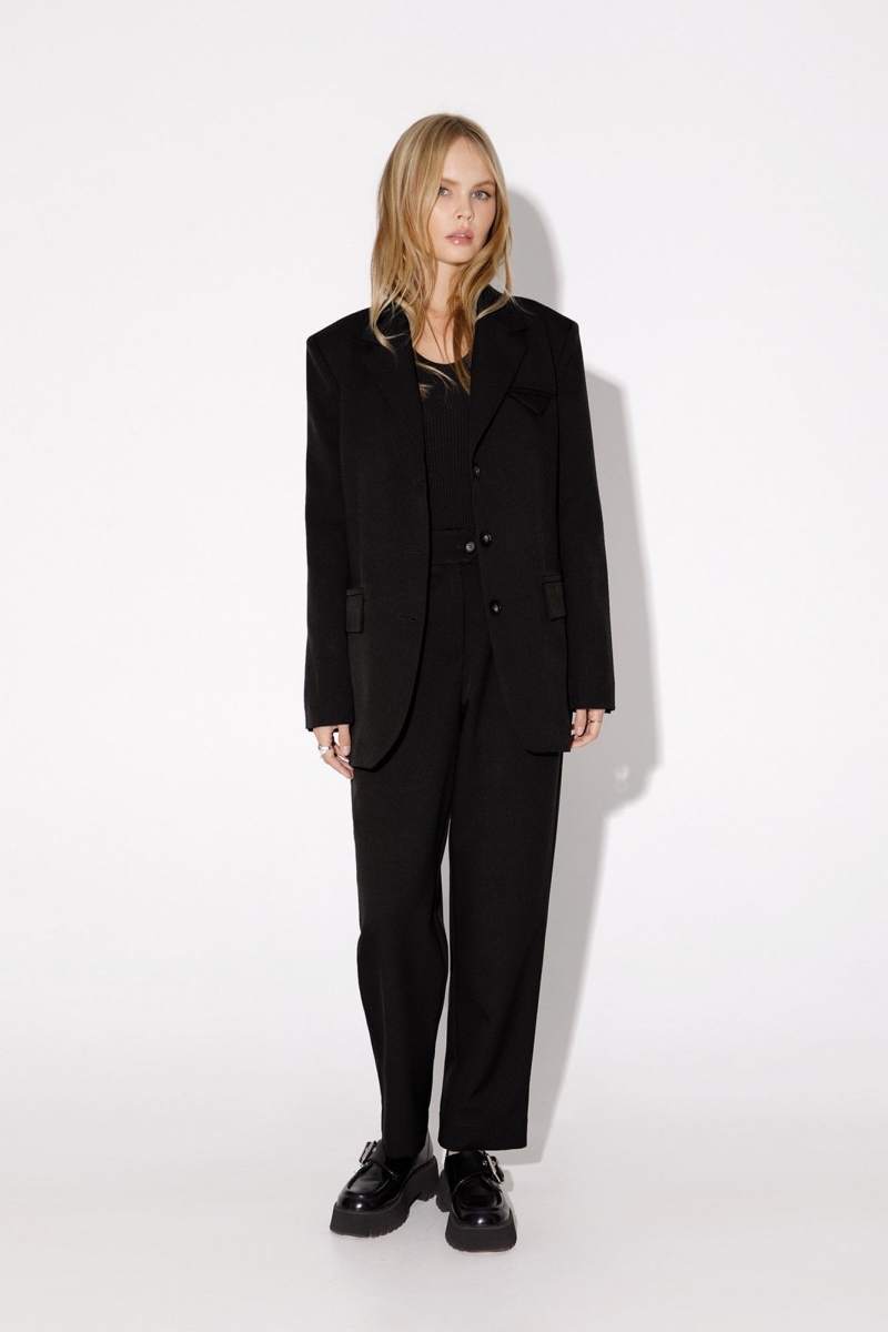 Текстильный костюм-тройка из свободного жакета, укороченного жилета и укороченных брюк с резинкой по поясу. Детали: жакет прямого силуэта, пиджачный воротник, перед с прорезными функциональными карманами, нагрудный декоративный карман, однобортная застежка на петли и пуговицы, спинка со средним швом, рукава втачные двухшовные с разрезами по низу, жакет на подкладке. Жилет прямого силуэта с фигурным низом, талиевые вытачки, застежка на петли и пуговицы, функциональные карманы, на подкладке. Брюки с высокой посадкой, притачной пояс со шлевками, задняя часть пояса эластичная- с резинкой, застежка на молнию и пуговицу, боковые карманы, передние половины с двумя складками. Длина жакета по спинке около 72 см в размерах 40-46 и около 74 см в размерах 48-52, длина рукавов около 62,5 см. Длина жилета по спинке около 39 см в размерах 40-46 и около 43 см в размерах 48-52. Длина брюк по боковому шву с поясом около 99 см в размерах 40-46 и около 100,5 см в размерах 48-52, длина по внутреннему шву около 69,5 см.