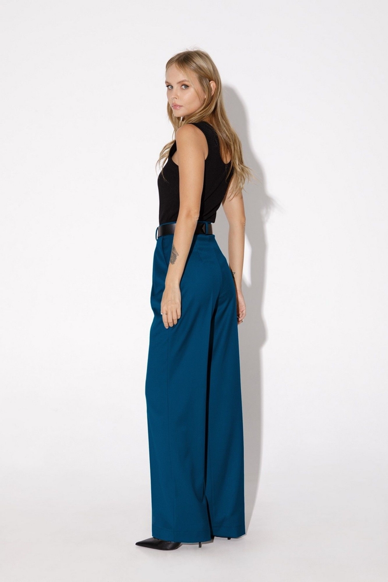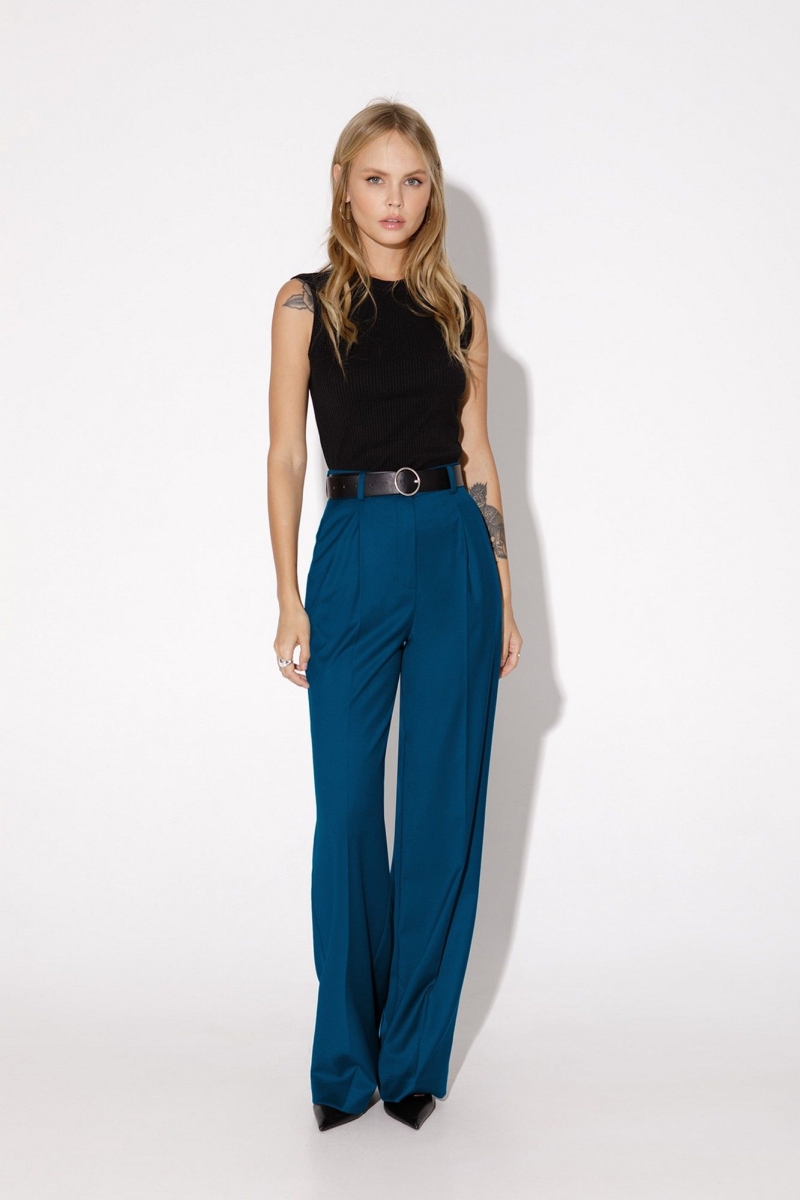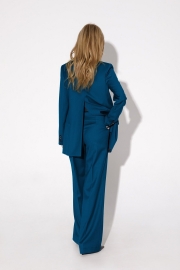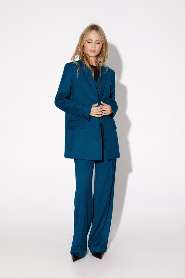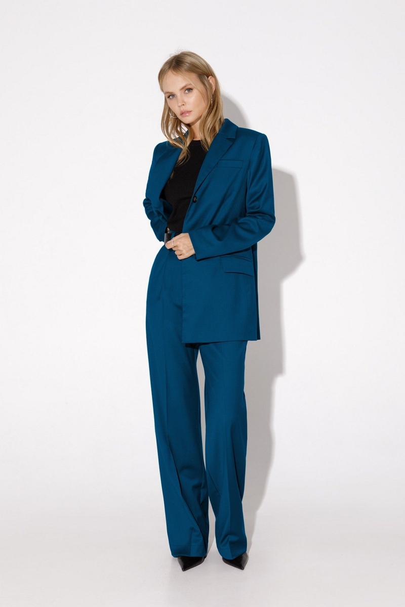 Текстильный костюм-двойка из трапециевидного жакета с высокой шлицей по спинке и прямых брюк со стрелками. Детали: свободный покрой, пиджачный воротник, талиевые вытачки, функциональный нагрудный карман, прорезные карманы с клапанами, застежка на пуговицы, спинка со средним швом и высокой шлицей, рукава втачные двухшовные, жакет на подкладке. Брюки с высокой посадкой на притачном поясе со шлевками, передние половины с небольшими застроченными мягкими складками и заутюженными стрелками, застежка на молнию и пуговицу, боковые карманы. Длина жакета по спинке около 74/76 см, длина рукава около 61 см. Длина брюк по боковому шву с поясом около 113/114,5 см.