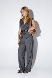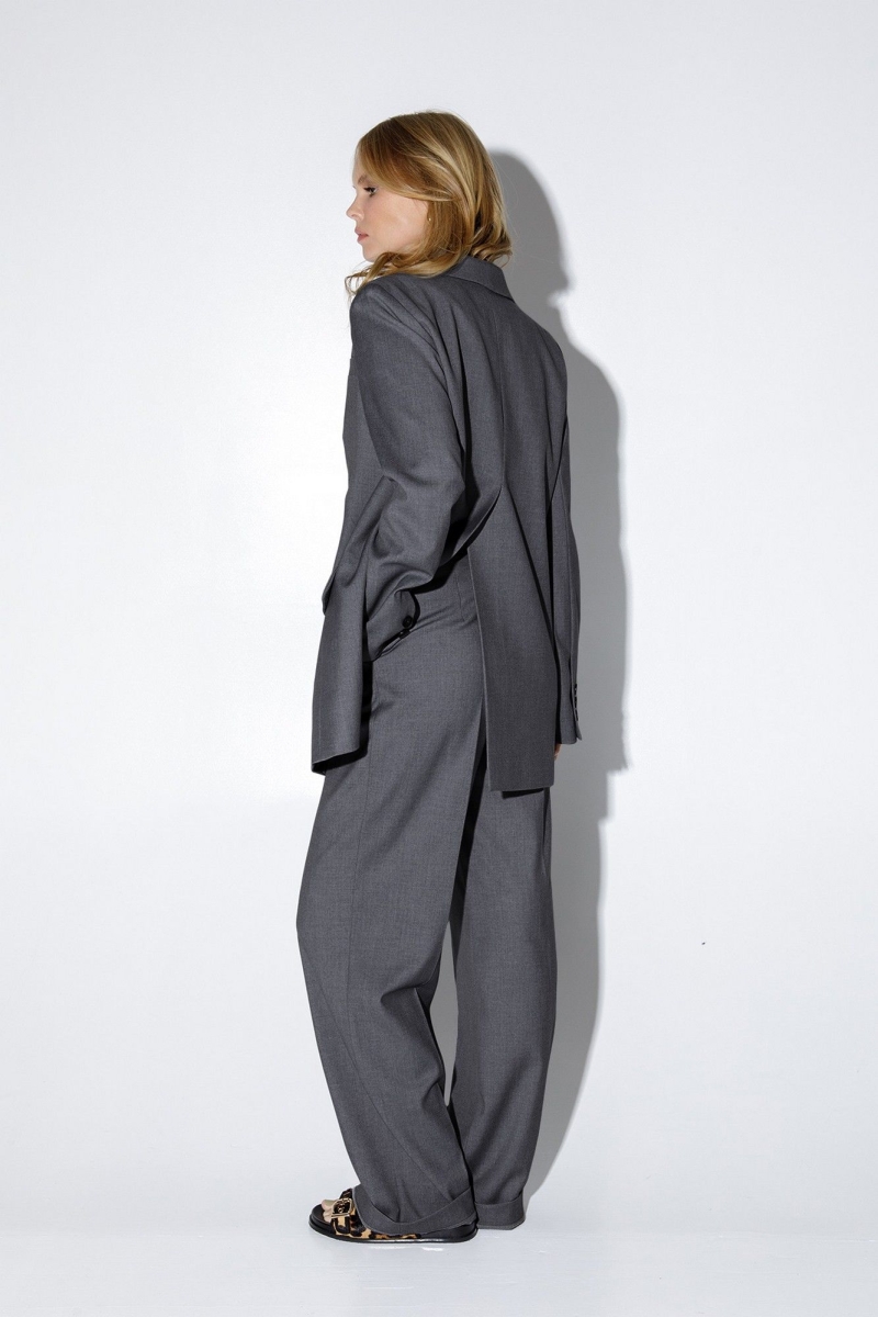Текстильный костюм-тройка из трапециевидного жакета с высокой шлицей по спинке, полуприлегающего жилета и прямых брюк со стрелками. Детали: свободный покрой, пиджачный воротник, талиевые вытачки, функциональный нагрудный карман, прорезные карманы с клапанами, застежка на пуговицы, спинка со средним швом и высокой шлицей, рукава втачные двухшовные, жакет на подкладке. Жилет полуприлегающего силуэта, талиевые вытачками, застежка на петли и пуговицы, функциональные карманы, фигурный низ, на подкладке. Брюки с высокой посадкой на притачном поясе со шлевками, передние половины с небольшими застроченными мягкими складками и заутюженными стрелками, застежка на молнию и пуговицу, боковые карманы. Длина жакета по спинке около 74/76 см, длина рукава около 61 см; длина жилета по спинке около 48,5/51,5 см; длина брюк по боковому шву с поясом около 113/114,5 см