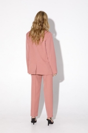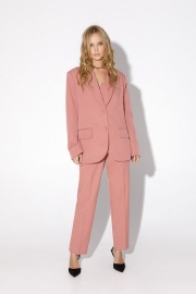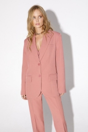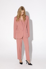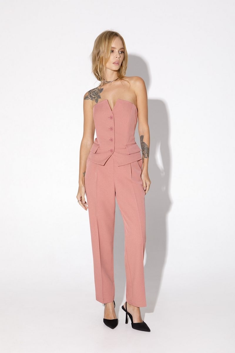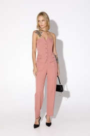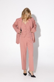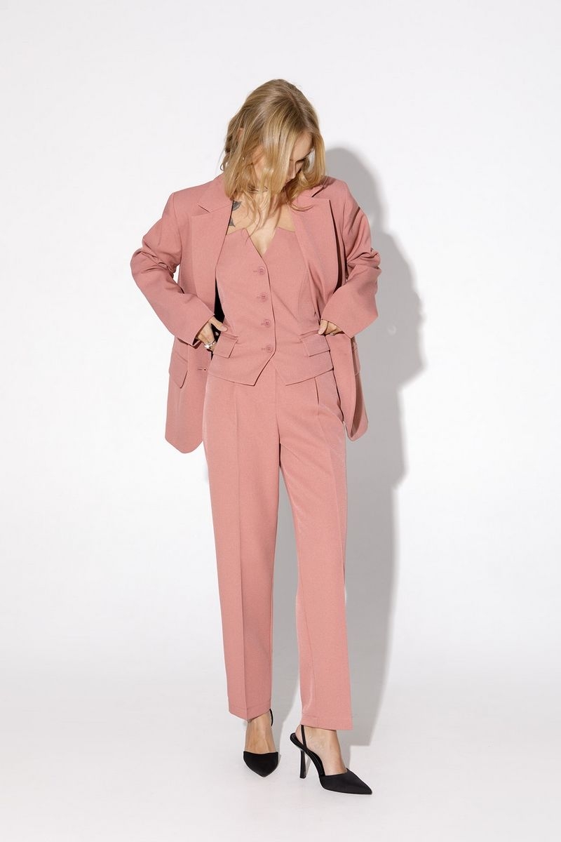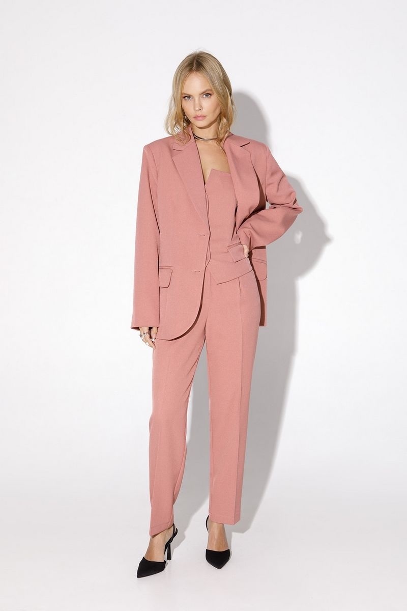 Текстильный костюм-тройка из оверсайз жакета, топа-корсета и укороченных брюк со стрелками. Детали: жакет прямого силуэта, расширенная линия плеч, пиджачный воротник, перед с прорезными функциональными карманами, однобортная застежка на петли и пуговицы, спинка со средним швом и шлицей, рукава втачные двухшовные, на подкладке. Топ-корсет прилегающего силуэта, рельефные швы с регилином, функциональные карманы, застежка по переду на петли и пуговицы, спинка с эластичной вставкой, фигурный низ. Брюки с высокой посадкой на притачном поясе со шлевками, передние половины с небольшими застроченными мягкими складками и заутюженными стрелками, застежка на молнию и пуговицу, боковые карманы. Длина жакета по спинке около 69 см в размерах 40-46 и около 72 см в размерах 48-52, длина рукавов около 62 см. Длина топа по спинке около 27,5 см в размерах 40-46 и около 29 см в размерах 48-52. Длина брюк по боковому шву с поясом около 99/100,5 см, длина по внутреннему шву около 69,5 см.