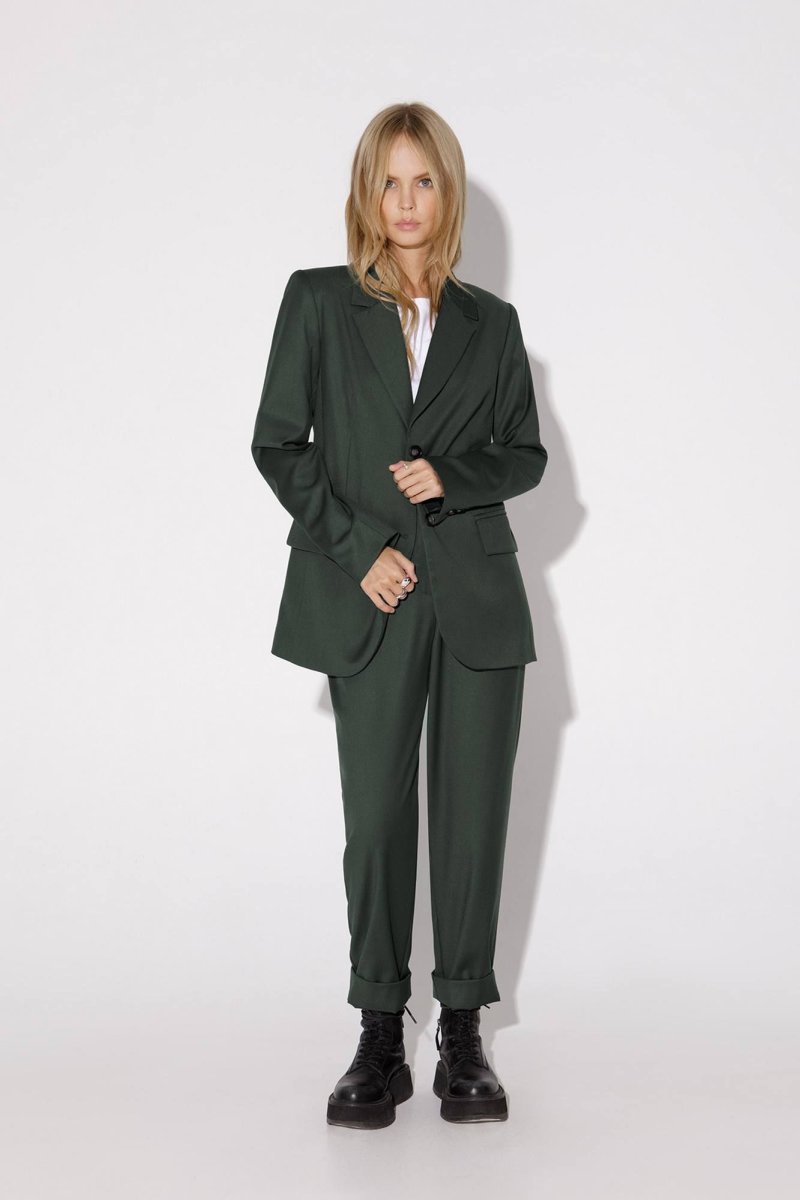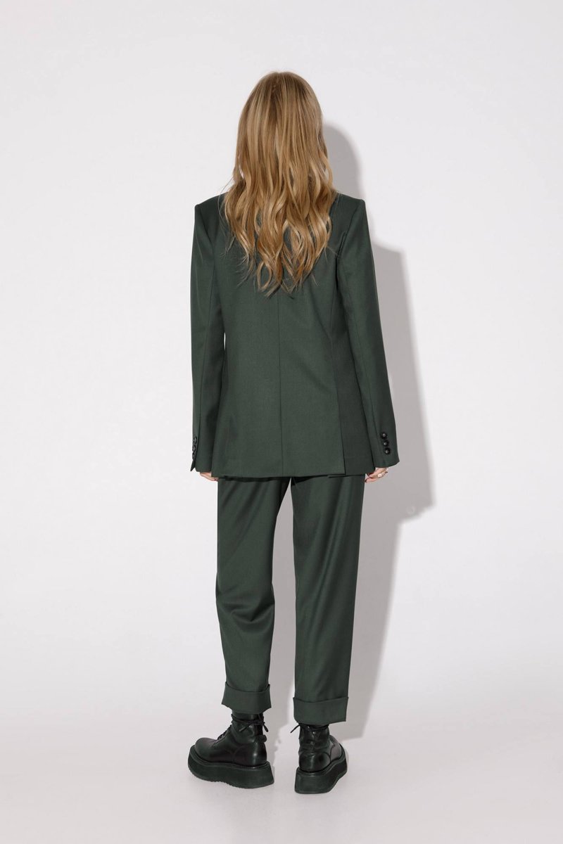 Текстильный костюм-двойка из свободного жакета со шлицами и брюк со складками. Детали: жакет полуприлегающего силуэта, талиевые вытачки, пиджачный воротник, застежка на две петли и пуговицы, функциональные карманы, рукава и спинка со шлицами, жакет на подкладке. Брюки с высокой посадкой, притачной пояс со шлевками, задняя часть пояса эластичная- с резинкой, застежка на молнию и пуговицу, боковые карманы, передние половины с двумя складками.