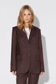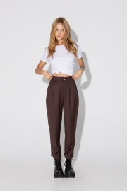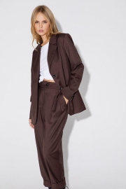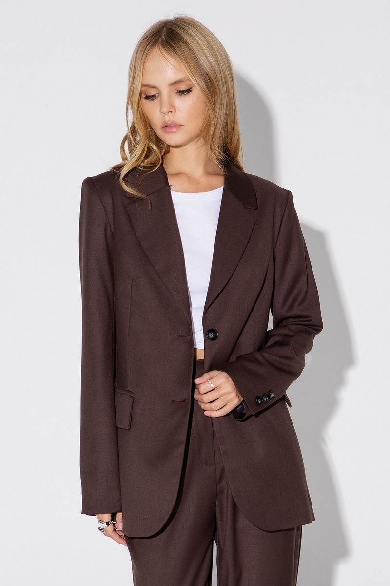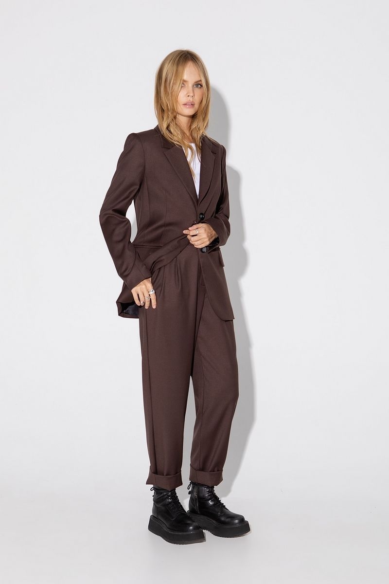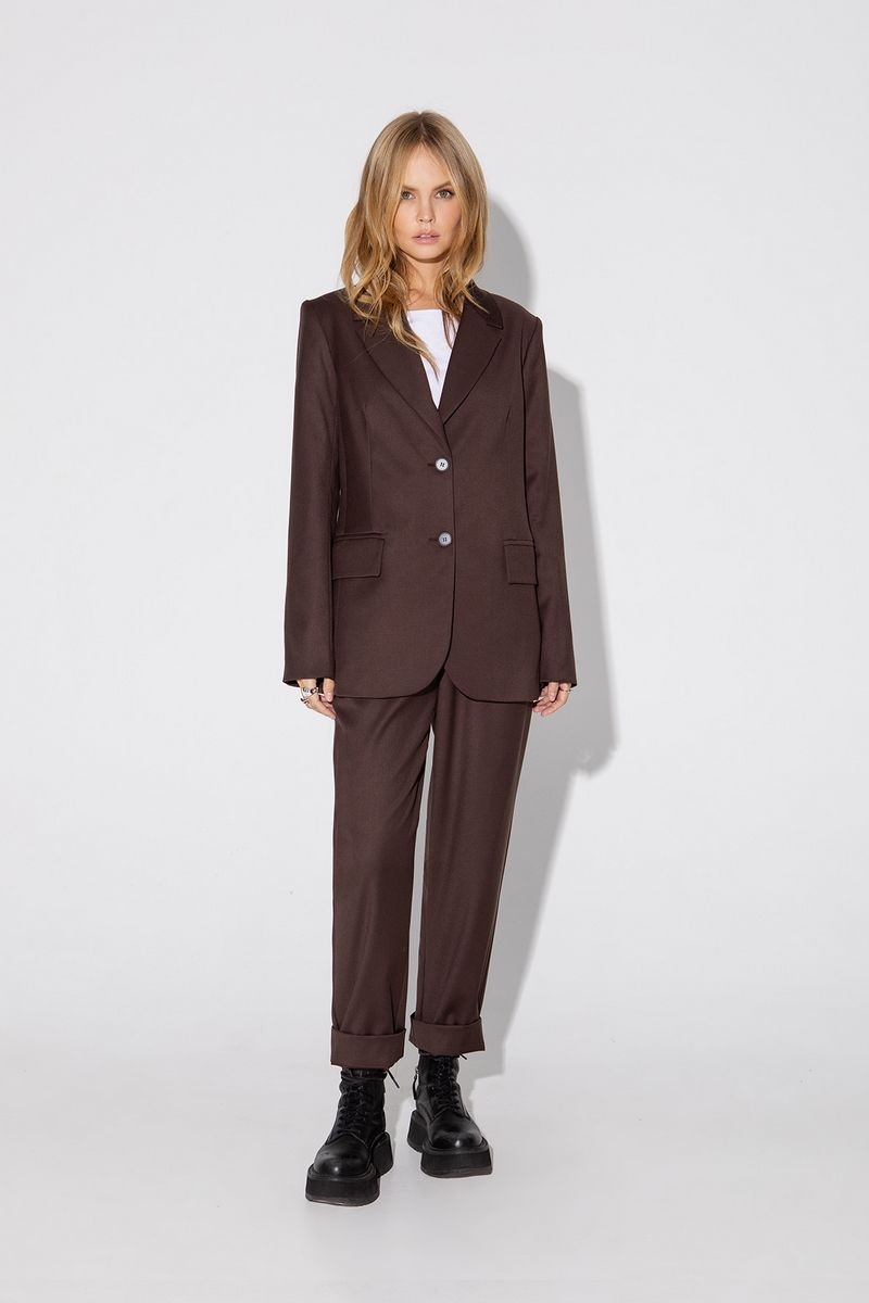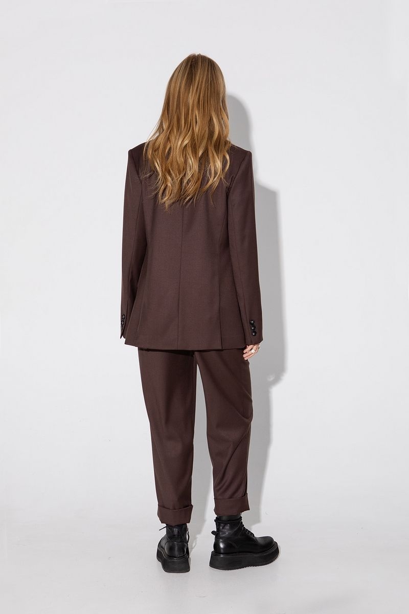 Текстильный костюм-двойка из свободного жакета со шлицами и брюк со складками. Детали: жакет полуприлегающего силуэта, талиевые вытачки, пиджачный воротник, застежка на две петли и пуговицы, функциональные карманы, рукава и спинка со шлицами, жакет на подкладке. Брюки с высокой посадкой, притачной пояс со шлевками, задняя часть пояса эластичная- с резинкой, застежка на молнию и пуговицу, боковые карманы, передние половины с двумя складками. Длина жакета по спинке около 70 см в размерах 40-46 и около 73 см в размерах 48-52, длина рукавов около 63 см. Длина брюк по боковому шву с поясом около 99,5 см в размерах 40-46 и около 101 см в размерах 48-52, длина по внутреннему шву около 70 см.