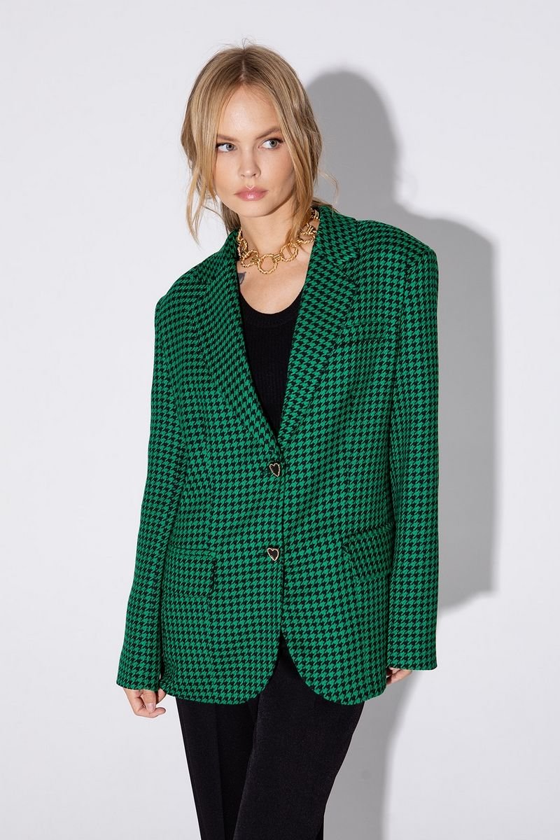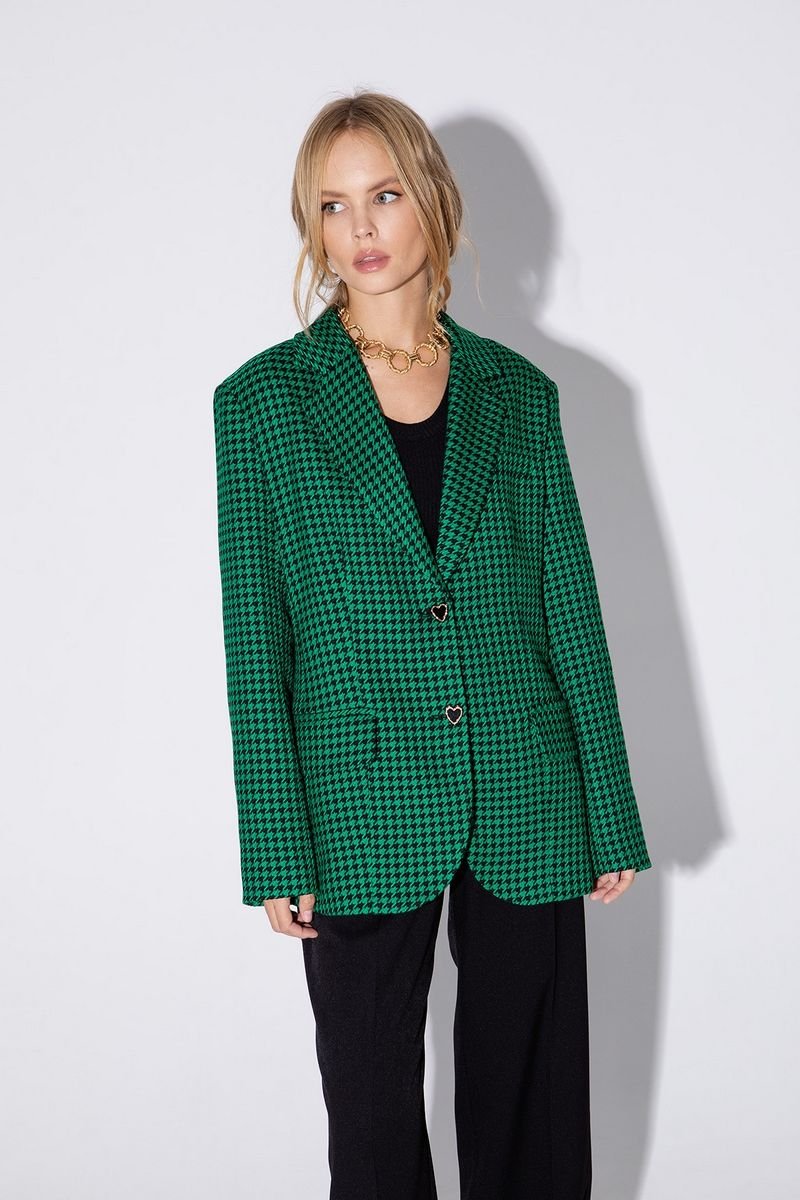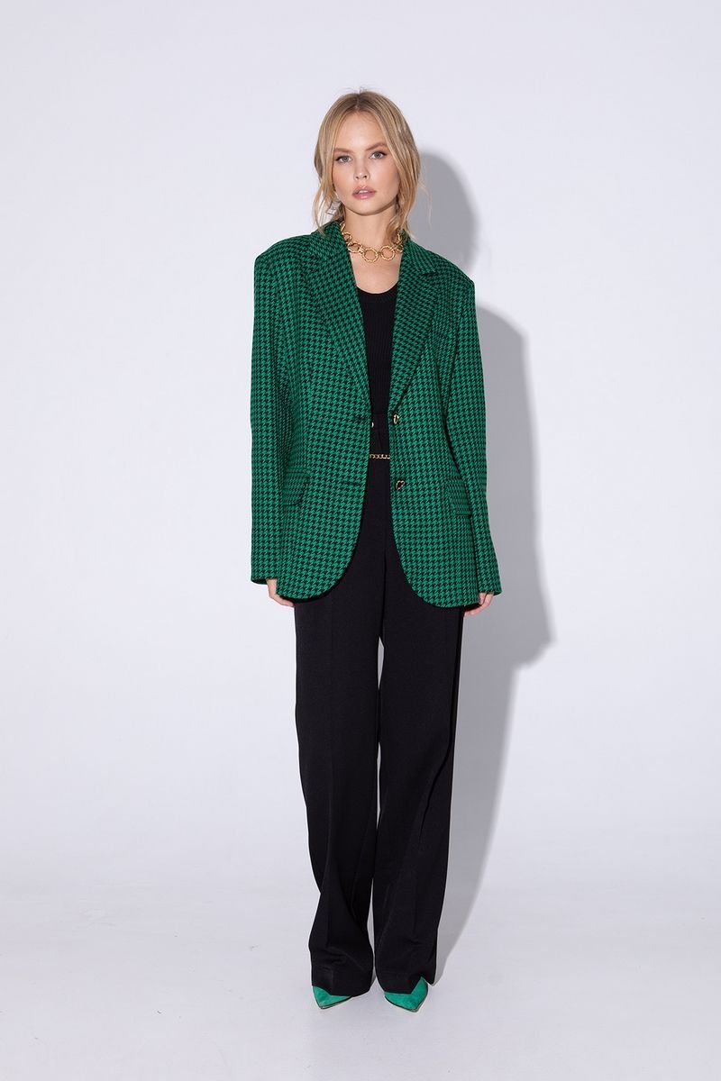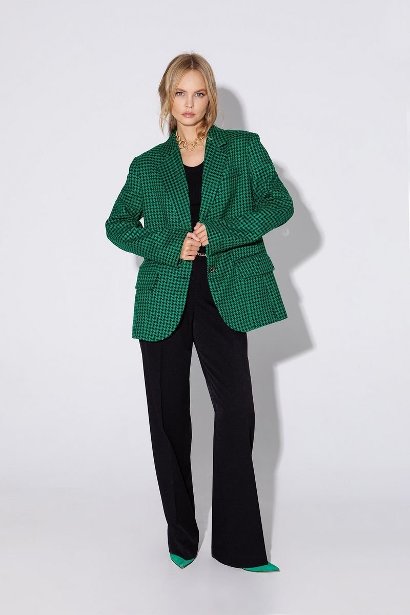 Комплект-двойка из оверсайз жакета с принтом и прямых брюк-палаццо со стрелками. Детали: жакет прямого силуэта, расширенная линия плеч, пиджачный воротник, перед с прорезными функциональными карманами, однобортная застежка на петли и пуговицы, спинка со средним швом и шлицей, рукава втачные двухшовные, жакет на подкладке. Брюки с высокой посадкой на притачном поясе со шлевками, застежка на молнию и пуговицу, боковые карманы, передние половины с заутюженными стрелками и двумя небольшими складками.