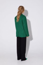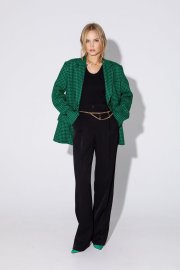 Длина жакета по спинке около 69 см в размерах 40-46 и около 72 см в размерах 48-52, длина рукавов около 62 см. Длина брюк по боковому шву с поясом около 113 см в размерах 40-46 и около 114,5 см в размерах 48-52, длина по внутреннему шву около 82 см.
