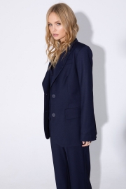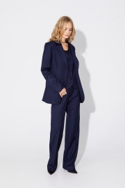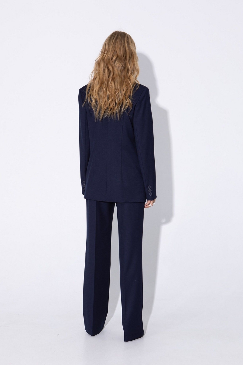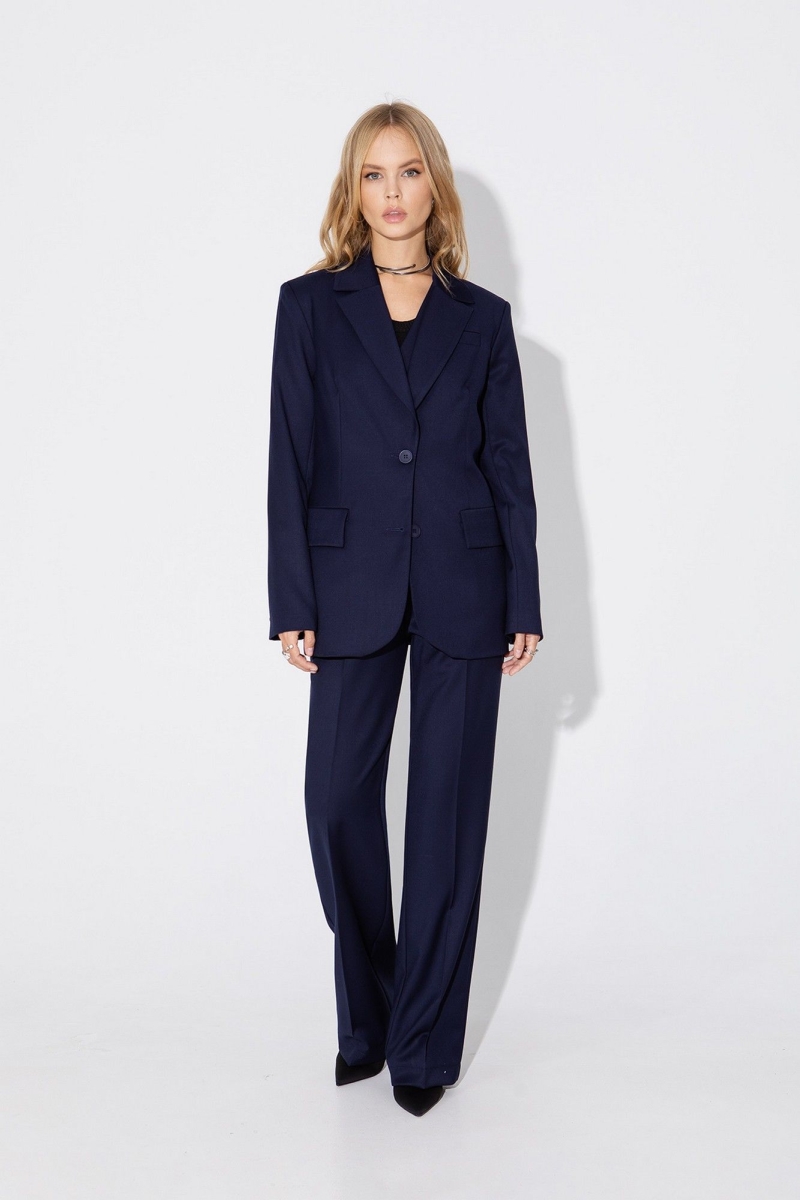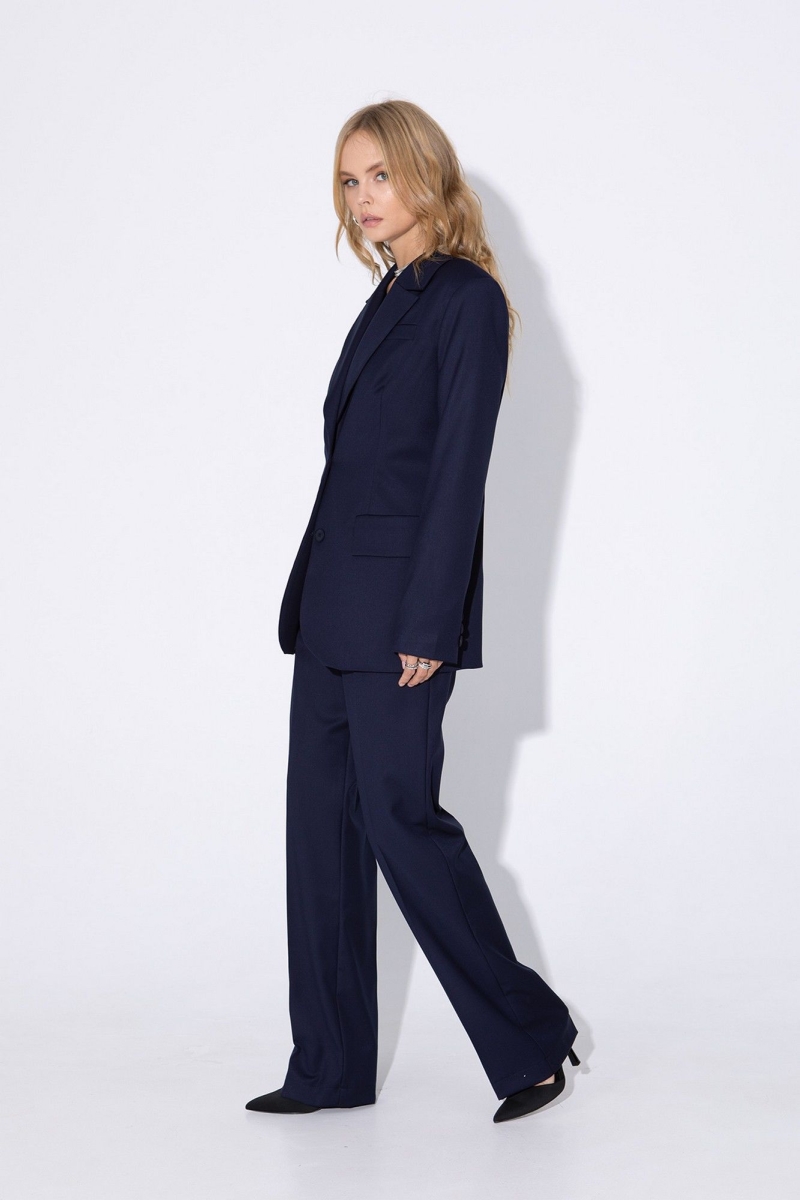 Текстильный костюм-двойка из однобортного жакета и прямых брюк с высокой посадкой. Детали: жакет полуприлегающего силуэта, вытачки по переду и спинке, пиджачный воротник, функциональные карманы, спинка со средним швом, втачные двухшовные рукава, жакет на подкладке. Брюки на притачном поясе со шлевками, передние половины с небольшими мягкими складками и заутюженными стрелками, застежка на молнию и пуговицу, боковые карманы. Длина жакета по спинке около 69 см в размерах 40-46 и около 72 см в размерах 48-52, длина рукавов около 62 см. Длина брюк по боковому шву с поясом около 112,5 в размерах 40-46 и около 114 см в размерах 48-52, длина по внутреннему шву около 80 см.