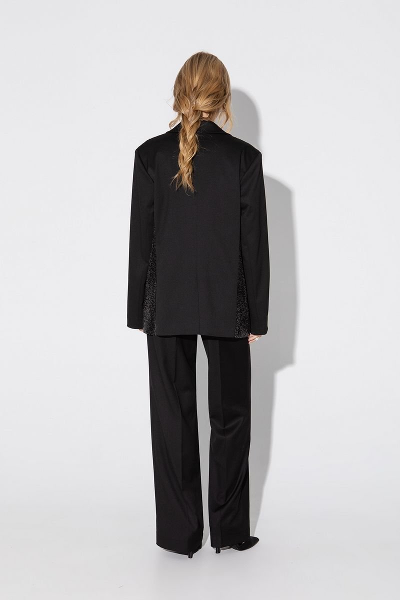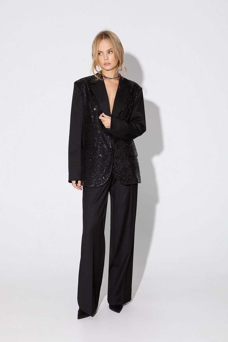 Комплект-двойка из оверсайз жакета с отделкой из пайеток и прямых брюк-палаццо со стрелками. Детали: жакет прямого силуэта, расширенная линия плеч, пиджачный воротник, перед с прорезными функциональными карманами, однобортная застежка на петли и пуговицы, спинка со средним швом и шлицей, рукава втачные двухшовные, жакет на подкладке. Брюки с высокой посадкой на притачном поясе со шлевками, застежка на молнию и пуговицу, боковые карманы, передние половины с заутюженными стрелками и двумя небольшими складками.