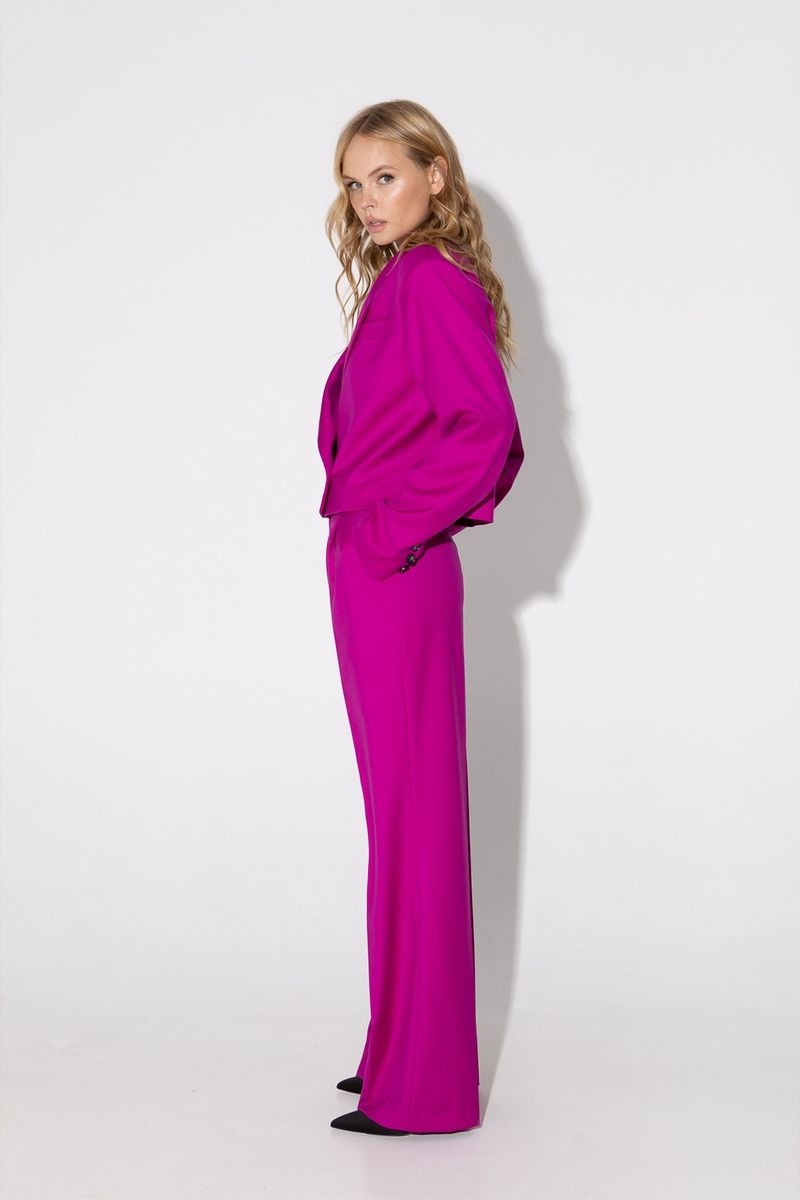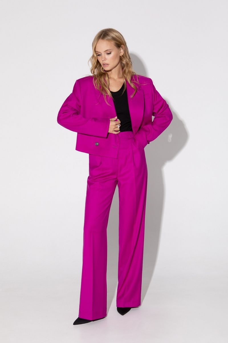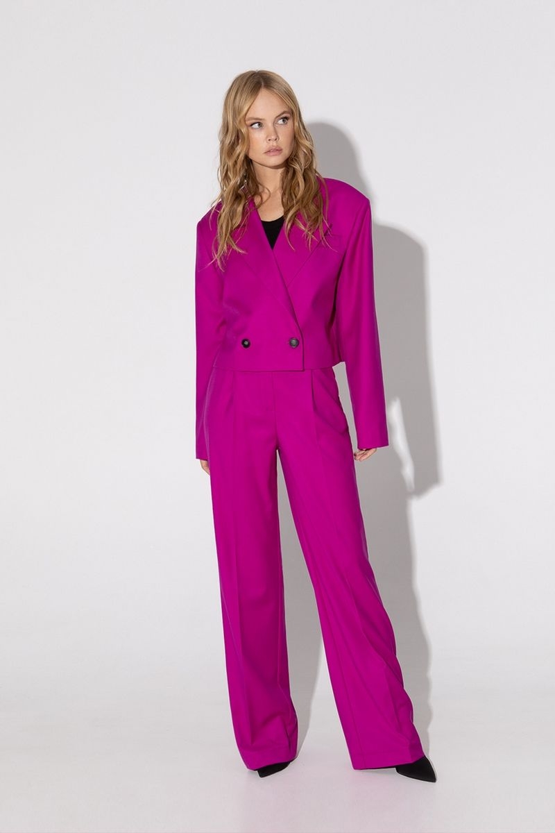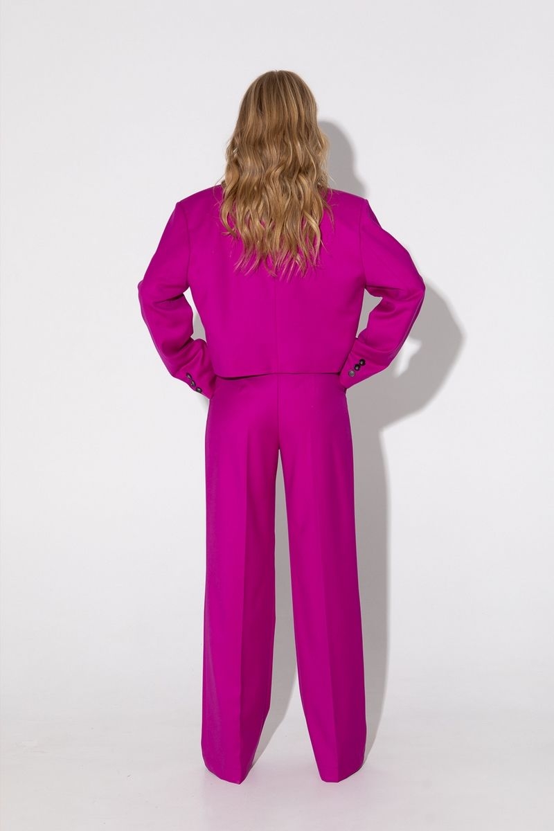 Костюм-двойка из укороченного оверсайз жакета с расширенными плечами и широких брюк- палаццо. Детали: прямой силуэт, спущенная линия плеча, пиджачный воротник, перед с функциональным нагрудным карманом, застежка двубортная на петли и пуговицы, рукава втачные двухшовные, жакет на подкладке. Брюки с высокой посадкой на притачном поясе со шлевками, передние половины с небольшими застроченными мягкими складками и заутюженными стрелками, застежка на молнию и пуговицу, боковые карманы. Длина жакета по спинке около 47 см в размерах 40-46 и около 49 см в размерах 48-52, длина рукава около 60 см. Длина брюк по боковому шву с поясом около 113/114,5 см.