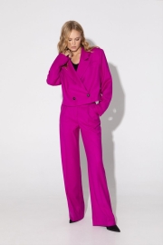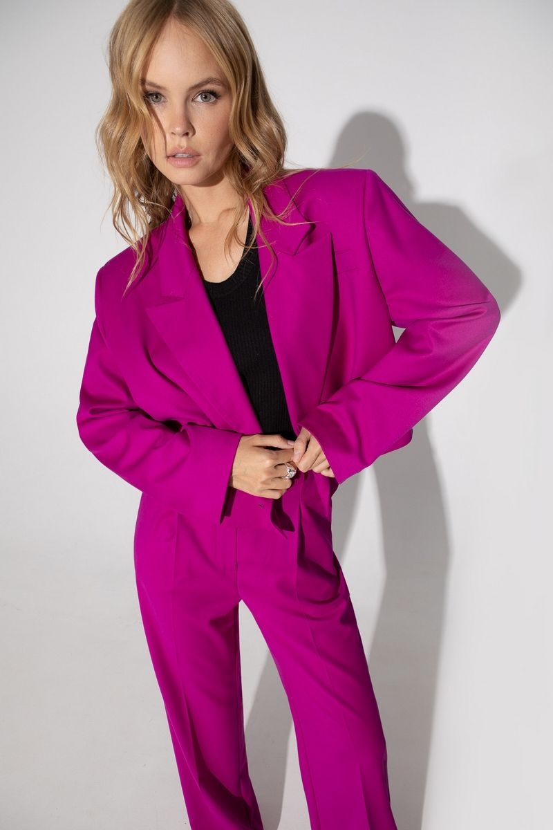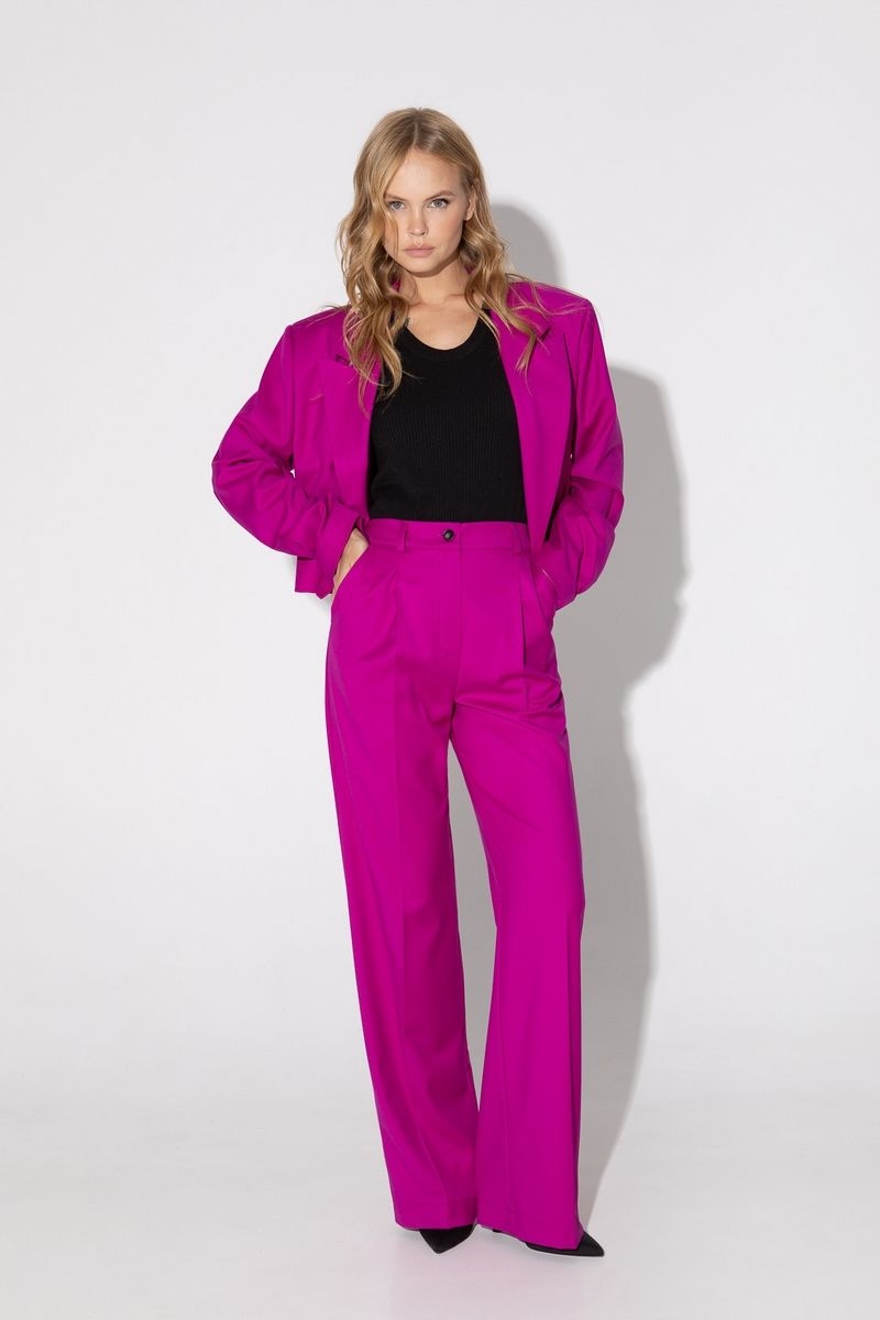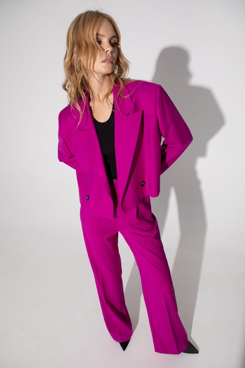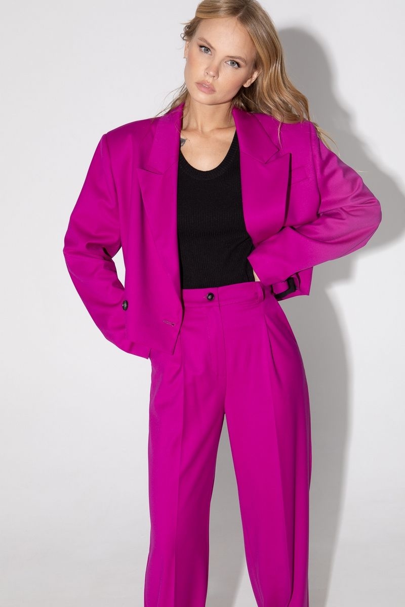 Костюм-двойка из укороченного оверсайз жакета с расширенными плечами и широких брюк- палаццо. Детали: прямой силуэт, спущенная линия плеча, пиджачный воротник, перед с функциональным нагрудным карманом, застежка двубортная на петли и пуговицы, рукава втачные двухшовные, жакет на подкладке. Брюки с высокой посадкой на притачном поясе со шлевками, передние половины с небольшими застроченными мягкими складками и заутюженными стрелками, застежка на молнию и пуговицу, боковые карманы. Длина жакета по спинке около 47 см в размерах 40-46 и около 49 см в размерах 48-52, длина рукава около 60 см. Длина брюк по боковому шву с поясом около 113/114,5 см.