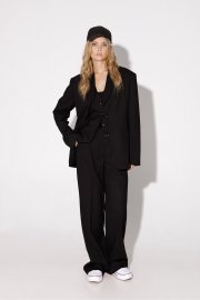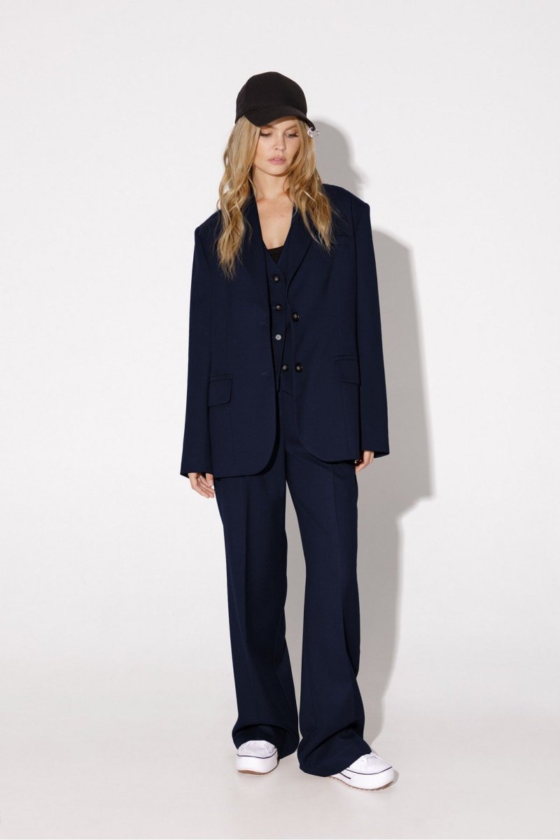 Текстильный костюм-тройка из оверсайз жакета, из полуприлегающего жилета и прямых брюк-палаццо со стрелками. Детали: жакет прямого силуэта, расширенная линия плеч, пиджачный воротник, перед с прорезными функциональными карманами, однобортная застежка на петли и пуговицы, спинка со средним швом и шлицей, рукава втачные двухшовные, жакет на подкладке. Жилет с талиевыми вытачками, застежка на петли и пуговицы, функциональные карманы, фигурный низ, на подкладке. Брюки с высокой посадкой на притачном поясе со шлевками, застежка на молнию и пуговицу, боковые карманы, передние половины с заутюженными стрелками и двумя небольшими складками.