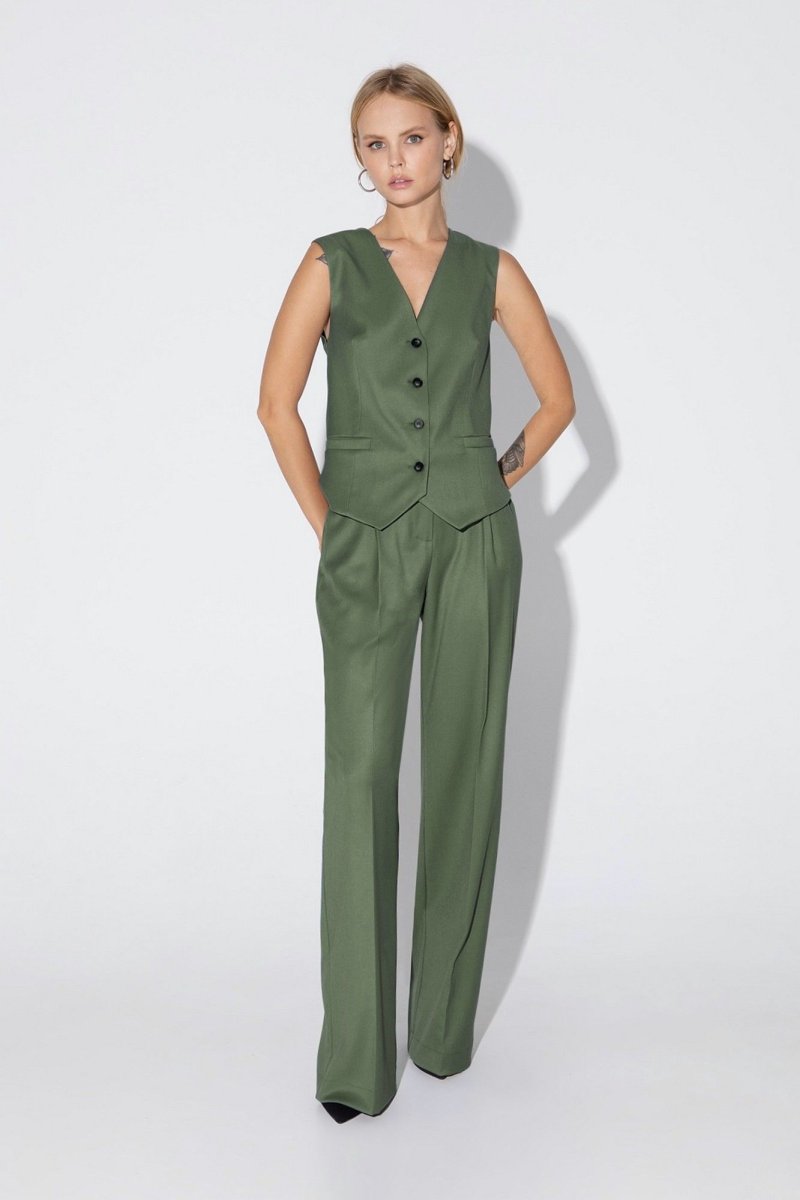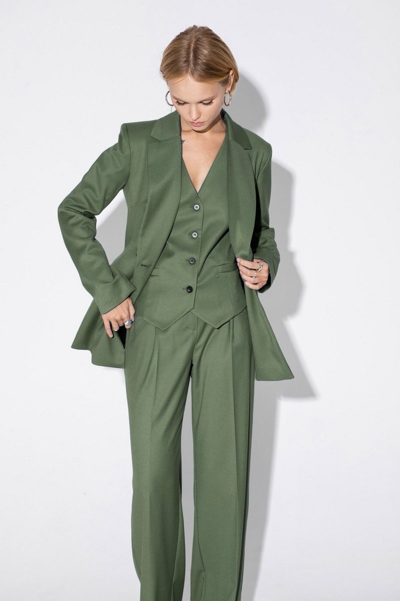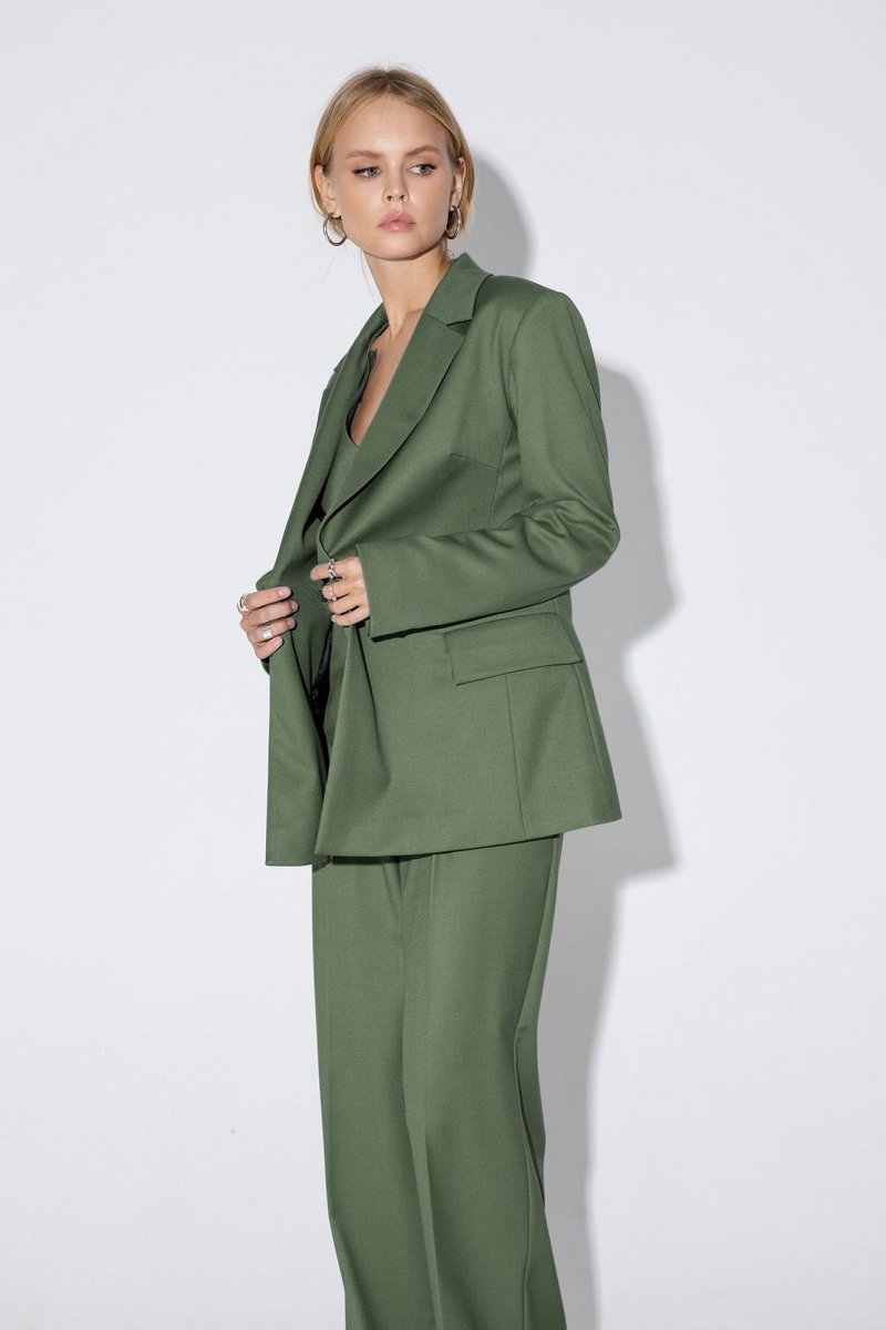 Текстильный костюм-тройка из двубортного полуприлегающего жакета, жилета и прямых брюк со стрелками. Детали: жакет с отрезными бочками и нагрудными вытачками, пиджачный воротник, прорезные карманы, застежка на петли и пуговицы, спинка со средним швом, втачные двухшовные рукава, жакет на подкладке. Жилет полуприлегающего силуэта, талиевые вытачками, застежка на петли и пуговицы, функциональные карманы, фигурный низ, на подкладке. Брюки с высокой посадкой на притачном поясе со шлевками, передние половины с небольшими застроченными мягкими складками и заутюженными стрелками, застежка на молнию и пуговицу, боковые карманы.