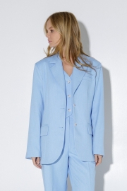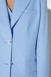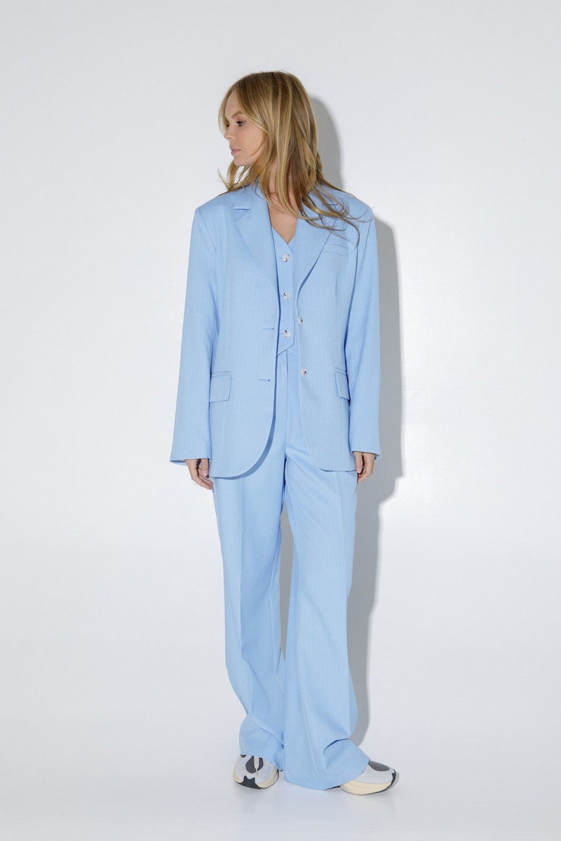 Костюм-двойка из оверсайз жакета и прямых широких брюк со стрелками из текстильной ткани в полоску. Детали: жакет прямого силуэта, расширенная линия плеч, пиджачный воротник, перед с прорезными функциональными карманами, однобортная застежка на петли и пуговицы, спинка со средним швом и шлицей, рукава втачные двухшовные, жакет на подкладке. Брюки с высокой посадкой на притачном поясе со шлевками, застежка на молнию и пуговицу, боковые карманы, передние половины с заутюженными стрелками и двумя небольшими складками. Задние части брюк с вытачками и заутюженными стрелками.
