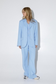 Длина жакета по спинке около 69 см в размерах 40-46 и около 72 см в размерах 48-52, длина рукавов около 62 см. Длина брюк по боковому шву с поясом около 113 см в размерах 40-46 и около 114,5 см в размерах 48-52, длина по внутреннему шву около 82 см