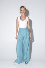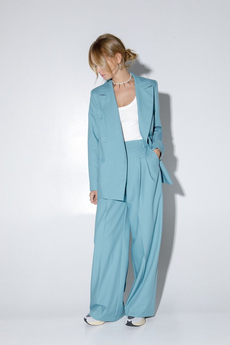 Текстильный костюм-двойка из свободного двубортного блейзера и широких брюк-палаццо с небольшими складками у пояса и заутюженными стрелками. Детали: жакет прямого силуэта, пиджачный воротник, перед с прорезными карманами, двубортная застежка на петли и пуговицы, спинка со средним швом, рукава втачные двухшовные, жакет на подкладке. Брюки на притачном поясе со шлевками, складки, застежка на молнию и пуговицу, боковые карманы. Задние части брюк с вытачками и имитацией карманов. Длина жакета по спинке около 66 см в размерах 40-46 и около 69 см в размерах 48-52, длина рукавов около 61 см. Длина брюк по боковому шву с поясом около 109,5 см, длина по внутреннему шву около 83 см