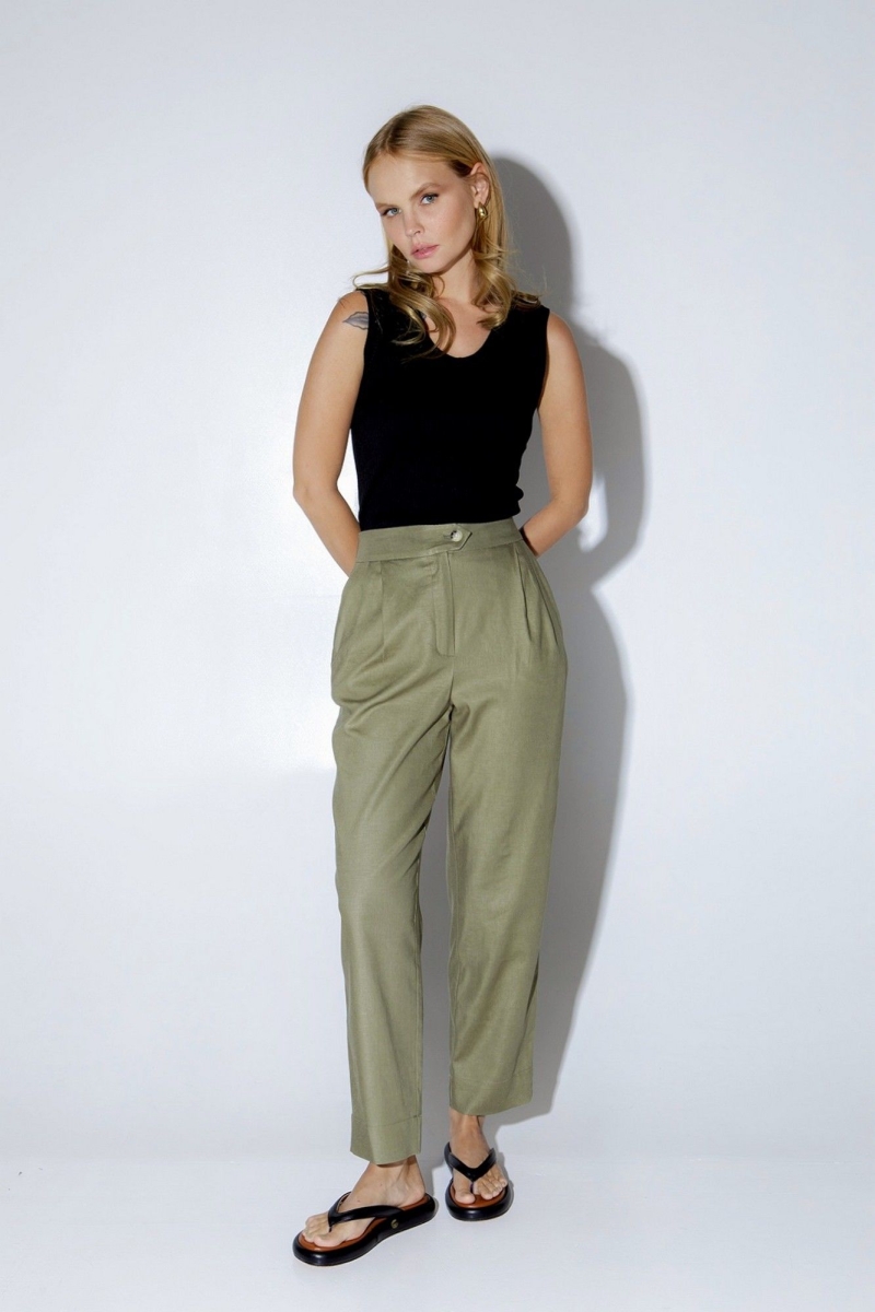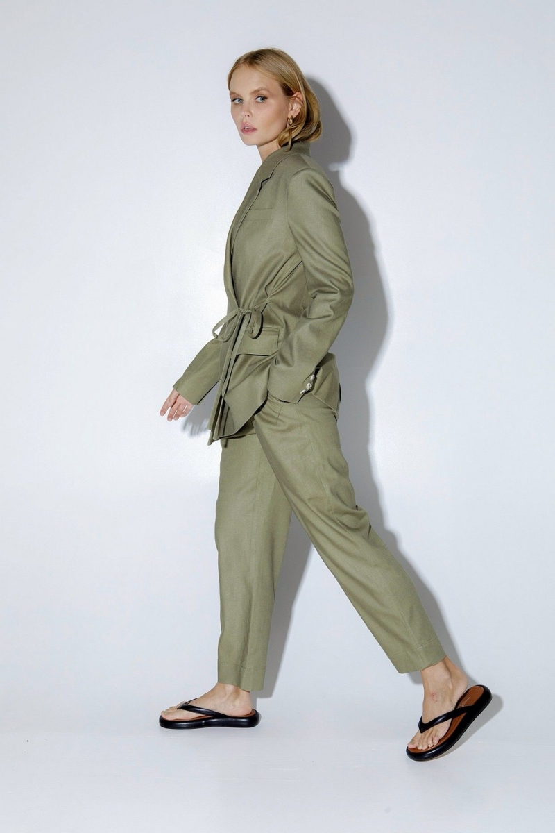 Льняной костюм-тройка из свободного прямого жакета с завязками, укороченных свободных брюк со складками и трикотажной базовой майки. Детали: жакет прямого силуэта, отрезные бочки, пиджачный воротник, застежка-завязки, функциональные карманы, рукава и спинка со шлицами, жакет на подкладке из 100% вискозы. Майка из трикотажа «лапша» прилегающего силуэта, глубокие вырезы горловины и пройм. Брюки с высокой посадкой, притачной пояс со шлевками, задняя часть пояса эластичная- с резинкой, застежка на молнию и пуговицу, боковые карманы, передние половины с двумя складками. Длина жакета по спинке около 71 см в размерах 40-46 и около 75 см в размерах 48-52, длина рукавов около 62 см. Длина майки от плечевого шва около 37 см в размерах 40-46 и около 39 см в размерах 48- 52 Длина брюк по боковому шву с поясом около 99,5 см в размерах 40-46 и около 101 см в размерах 48- 52, длина по внутреннему шву около 70 см.