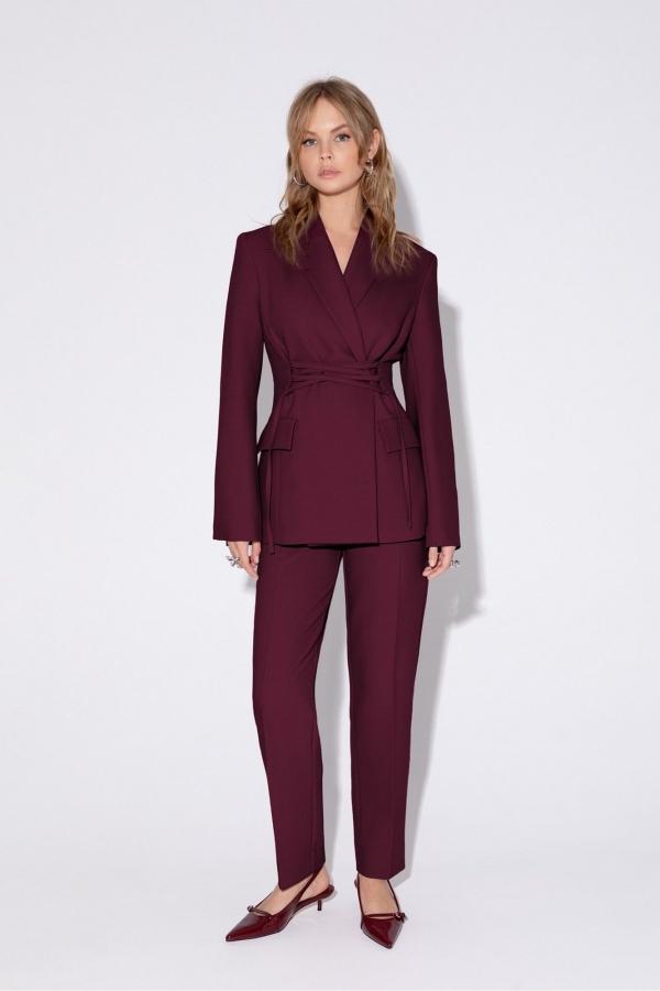 Текстильный костюм-двойка из жакета со шнуровкой с расширенной линией плеч и классических укороченный брюк со стрелками. Детали: жакет полуприлегающего силуэта, рельефы, пиджачный воротник, застежка на две петли и пуговицы, функциональные карманы, жакет на подкладке. Жакет также можно зашнуровать по бокам. Брюки на притачном поясе со шлевками, застежка на молнию и пуговицу, боковые карманы, передние половины заутюженными стрелками. Задние части брюк с вытачками, стрелками и имитацией карманов. Низ брюк с широкой подгибкой, при помощи подгибки можно регулировать длину, подвернув её. Длина по спинке около 68,5 в размерах 40-46 и около 71,5 см в размерах 48-52, длина рукавов около 63 см. Длина брюк по боковому шву с поясом около 101,5 см, длина по внутреннему шву около 74 см