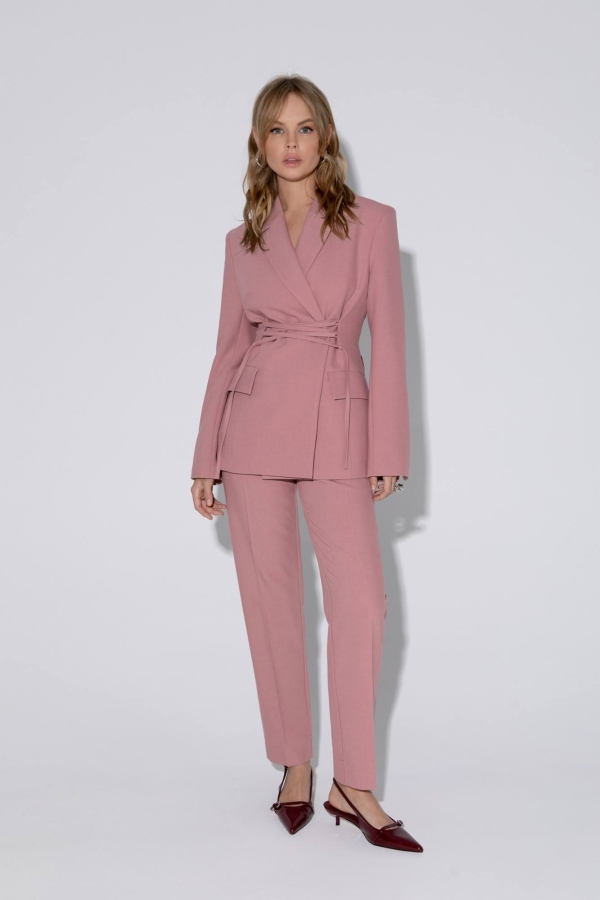 Текстильный костюм-двойка из жакета со шнуровкой с расширенной линией плеч и классических укороченный брюк со стрелками. Детали: жакет полуприлегающего силуэта, рельефы, пиджачный воротник, застежка на две петли и пуговицы, функциональные карманы, жакет на подкладке. Жакет также можно зашнуровать по бокам. Брюки на притачном поясе со шлевками, застежка на молнию и пуговицу, боковые карманы, передние половины заутюженными стрелками. Задние части брюк с вытачками, стрелками и имитацией карманов. Низ брюк с широкой подгибкой, при помощи подгибки можно регулировать длину, подвернув её. Длина по спинке около 68,5 в размерах 40-46 и около 71,5 см в размерах 48-52, длина рукавов около 63 см. Длина брюк по боковому шву с поясом около 101,5 см, длина по внутреннему шву около 74 см