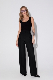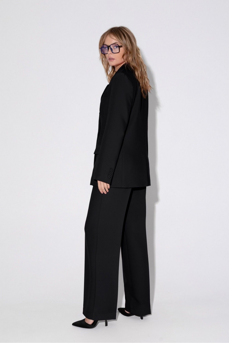 Текстильный костюм-двойка из свободного жакета и прямых брюк со стрелками. Детали: жакет свободного покроя и полуприлегающего силуэта, двубортная застежка на петли и пуговицы, отрезные бочки, пиджачный воротник, функциональные карманы, жакет на подкладке. Брюки с высокой посадкой, притачной пояс со шлевками, передние половины с небольшими застроченными мягкими складками и заутюженными стрелками, застежка на молнию и пуговицу, боковые карманы. Задние части брюк с вытачками и заутюженными стрелками. Пояс брюк прямой, без резинки. Длина жакета по спинке около 69 см в размерах 40-46 и около 72 см в размерах 48-52, длина рукавов около 62 см. Длина брюк по боковому шву с поясом около 114 в размерах 40-46 и около 115,5 см в размерах 48-52. Длина по внутреннему шву около 83 см