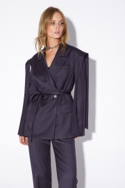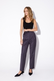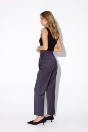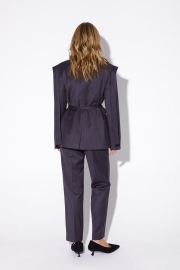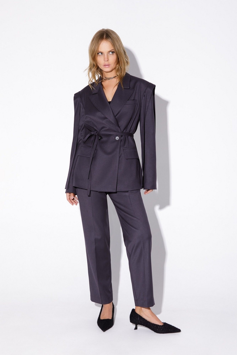 Текстильный костюм-двойка из свободного жакета с декором и укороченных брюк со стрелками. Детали: жакет свободного покроя и полуприлегающего силуэта, двубортная застежка на петли и пуговицы, отрезные бочки, пиджачный воротник, функциональные карманы, жакет на подкладке, съемный пояс. Брюки с высокой посадкой на притачном поясе со шлевками, передние половины с небольшими застроченными мягкими складками и заутюженными стрелками, застежка на молнию и пуговицу, боковые карманы. Задние части брюк с вытачками и имитацией карманов. Длина жакета по спинке около 69 см в размерах 40-46 и около 72 см в размерах 48-52, длина рукавов около 62 см. Длина брюк по боковому шву с поясом около 99 см в размерах 40-46 и около 100,5 см в размерах 48-52, длина по внутреннему шву около 69,5 см