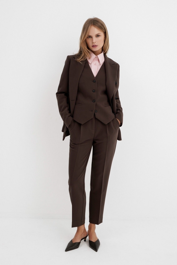 Текстильный костюм-тройка из двубортного жакета, полуприлегающего жилета и укороченных брюк со средней посадкой. Детали: жакет прямого силуэта, пиджачный воротник, перед с прорезными карманами, застежка на петли и пуговицы, спинка со средним швом, рукава втачные двухшовные, жакет на подкладке. Жилет полуприлегающего силуэта с фигурным низом, застежка на петли и пуговицы, на подкладке. Брюки на притачном поясе со шлевками, передние половины с небольшими мягкими складками и заутюженными стрелками, застежка на молнию и пуговицу, боковые карманы. Длина жакета по спинке около 66 см в размерах 40-46 и около 69 см в размерах 48-52, длина рукава около 61 см. Длина жилета по спинке около 48,5 см в размерах 40-46 и около 51,5 см в размерах 48-52. Длина брюк по боковому шву с поясом около 93,5 см в размерах 40-46 и около 95 см в размерах 48-52. Длина по внутреннему шву около 66 см.