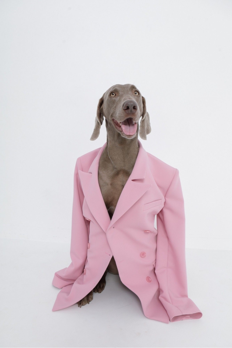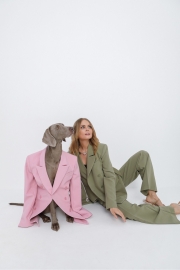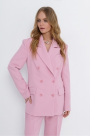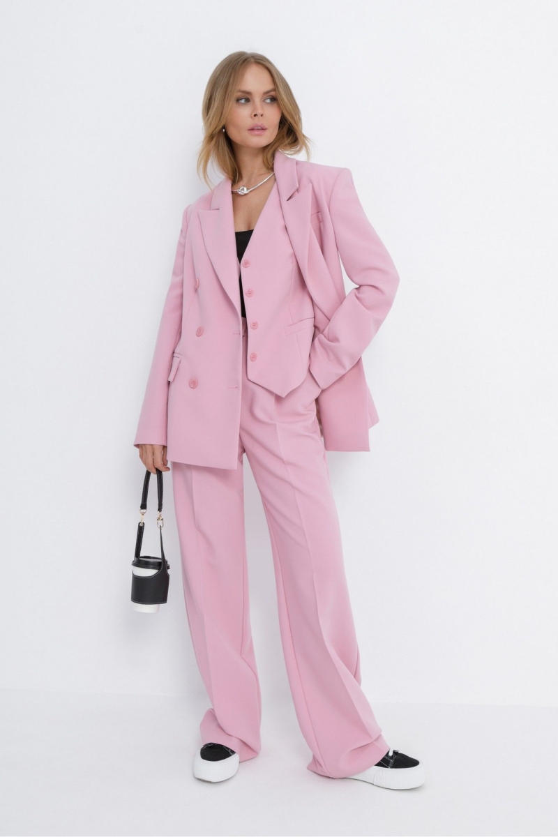 Текстильный костюм-двойка из свободного жакета и прямых широких брюк со стрелками. Детали: жакет свободного покроя и полуприлегающего силуэта, двубортная застежка на петли и пуговицы, отрезные бочки, пиджачный воротник, функциональные карманы, жакет на подкладке. Брюки с высокой посадкой, притачной пояс со шлевками, передние половины с небольшими застроченными мягкими складками и заутюженными стрелками, застежка на молнию и пуговицу, боковые карманы. Задние части брюк с вытачками и заутюженными стрелками. Пояс брюк прямой, без резинки. Длина жакета по спинке около 69 см в размерах 40-46 и около 72 см в размерах 48-52, длина рукавов около 62 см. Длина брюк по боковому шву с поясом около 114 в размерах 40-46 и около 115,5 см в размерах 48-52. Длина по внутреннему шву около 83 см