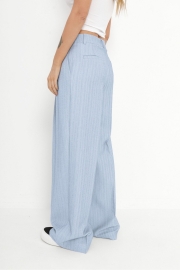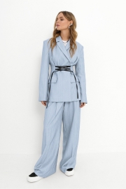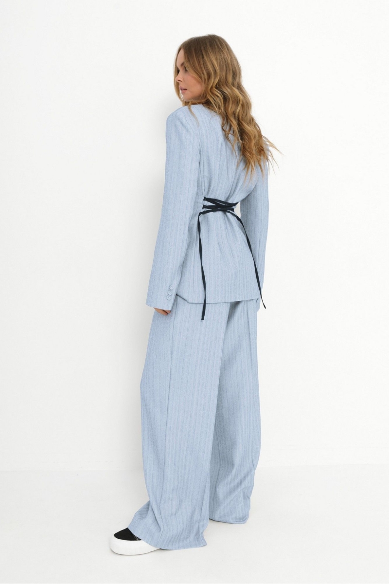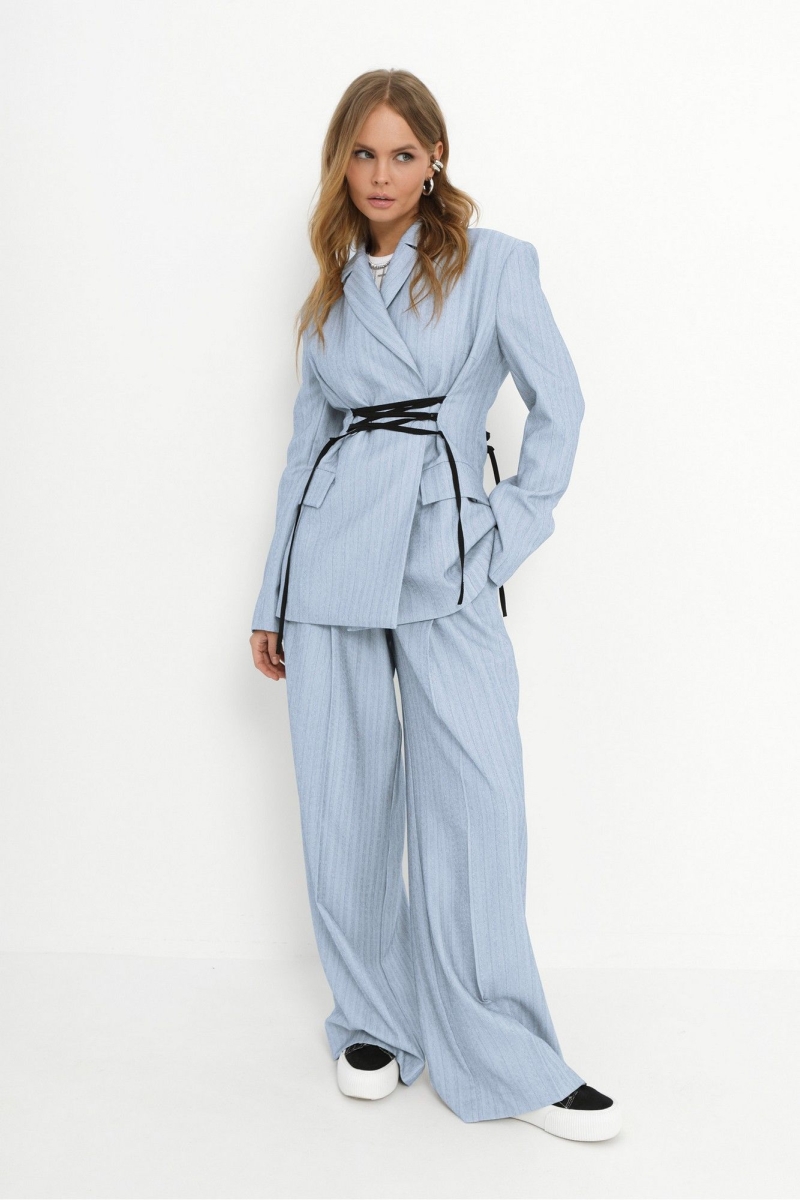 Костюм-двойка из жакета с контрастной шнуровкой и широких брюк-палаццо из текстильной ткани с рисунком «ёлочка». Детали: жакет полуприлегающего силуэта, рельефы, пиджачный воротник, застежка на две петли и пуговицы, функциональные карманы, жакет на подкладке. Жакет также можно зашнуровать по бокам. Брюки с притачным поясом со шлевками, складки у пояса, застежка на молнию и пуговицу, боковые карманы. Задние части брюк с вытачками и имитацией карманов. Длина жакета по спинке около 68,5 в размерах 40-46 и около 71,5 см в размерах 48-52, длина рукавов около 63 см. Длина брюк по боковому шву с поясом около 109,5 см, длина по внутреннему шву около 83 см