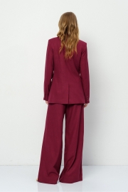 Льняной костюм-двойка из полуприлегающего жакета со шлицами и широких брюк на резинке. Детали: пиджачный воротник, талиевые вытачки, функциональный нагрудный карман, два прорезных кармана с клапанами, застежка на петли и пуговицы, спинка со средним швом и шлицей, рукава втачные двухшовные со шлицами по низу, жакет на хлопковой подкладке. Брюки с высокой посадкой на притачном эластичном поясе, без застежки, боковые карманы. Длина жакета по спинке около 69 см в размерах 40-46 и около 72 см в размерах 48-52, длина рукавов около 62 см. Длина брюк по боковому шву с поясом около 105 см в размерах 40-46 и около 106,5 см в размерах 48-52, длина по внутреннему шву около 78 см