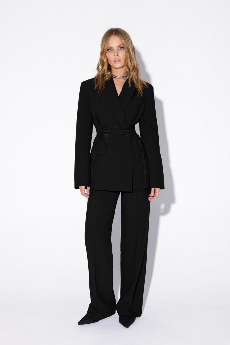 Костюм-двойка из жакета со шнуровкой и широких прямых брюк.