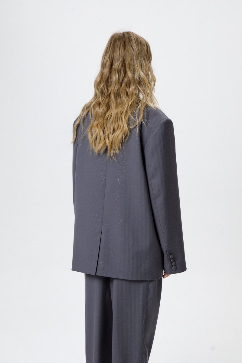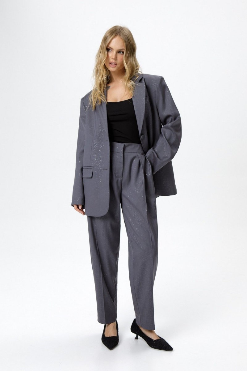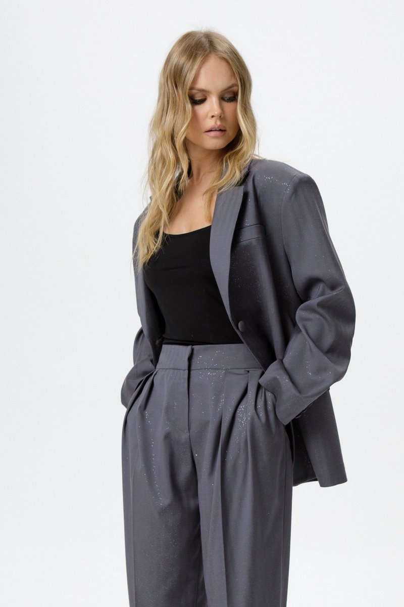 Костюм-двойка из оверсайз жакета и брюк со складками из костюмной ткани с блестками.